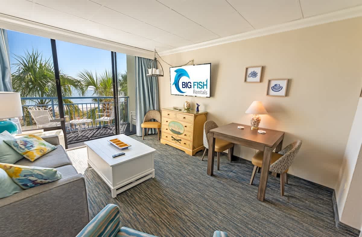Coral Beach 206 at Big Fish Rentals. This unit offers a direct oceanfront view from the private balcony. It’s conveniently located in the heart of Myrtle Beach, just minutes away from Broadway at the Beach, the airport, the boardwalk, many restaurants, golf courses, bars, entertainment venues, and more! We hope you enjoy this condo as much as we do. Remember, it comes with free Wi-Fi for your convenience.