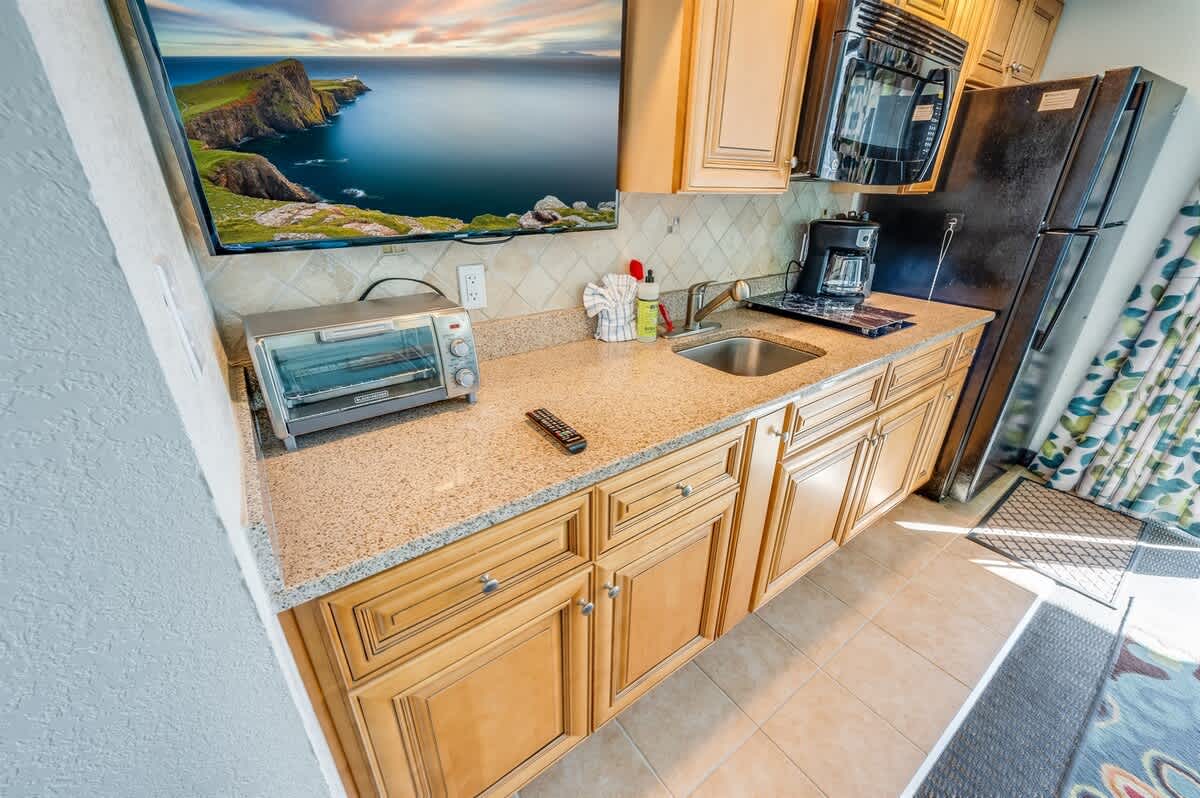 Upon entering the condo, you will first encounter a foyer, a private bathroom, and a bedroom to the left. Walking further down the hallway, you will enter the oceanfront main room, featuring a sofa, kitchen table, and cooking area with a direct view of the ocean. Both the balcony and living area (and bedroom) offer stunning ocean views, making it the perfect spot for enjoying morning coffee or evening cocktails. The condo is equipped with a full-sized fridge, stove, and microwave in the kitchen for your convenience.