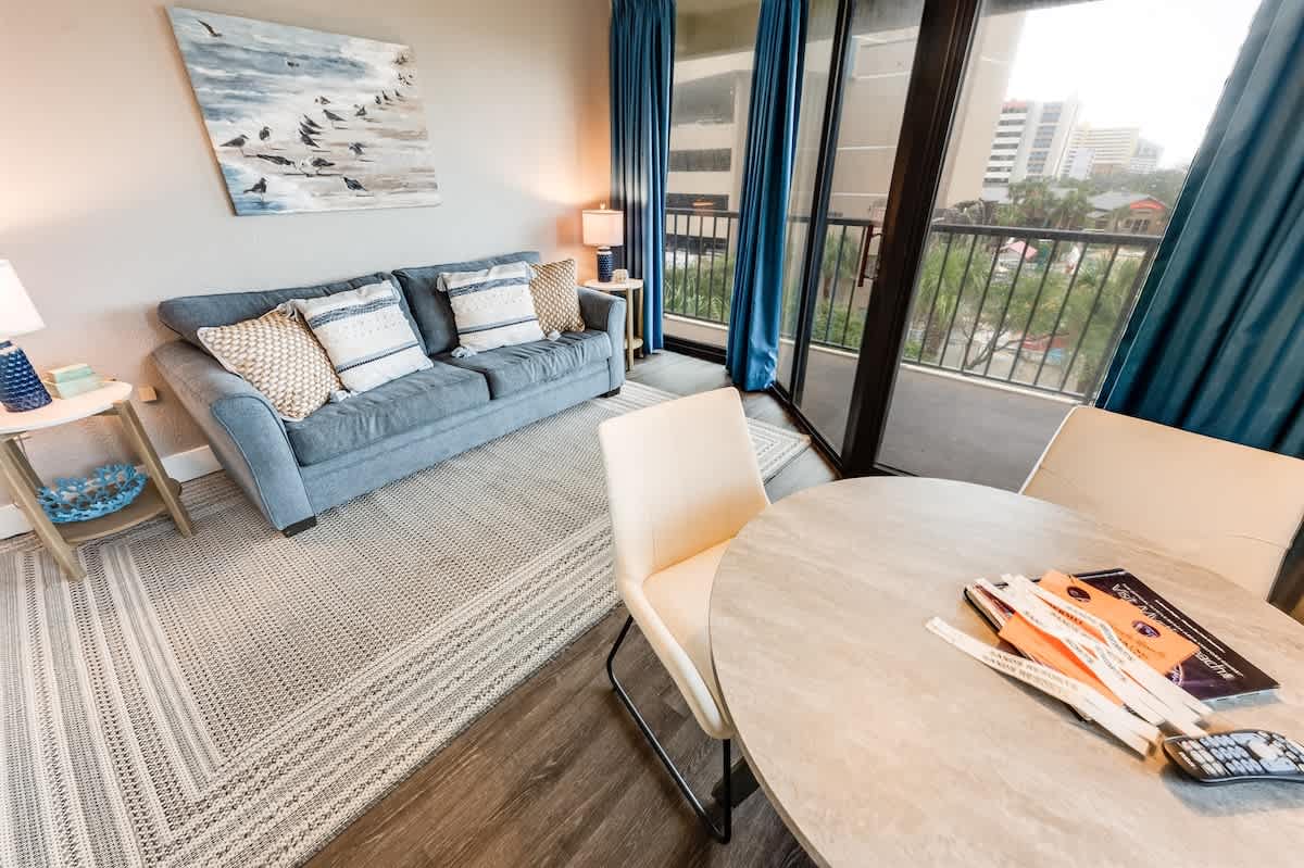 Presenting a gorgeous remodeled one-bedroom condo with an ocean view located on the fourth story of the Sand Dunes Villas III building. With 2 separate beds and a sleeper sofa, with a private balcony can accommodate up to six people. New linens and towels available. Wi-Fi enabled and recently refurbished with a new LCD TV, microwave, and refrigerator. Heated indoor pool, a lazy river, hot tubs, and both indoor and outdoor pools are available
