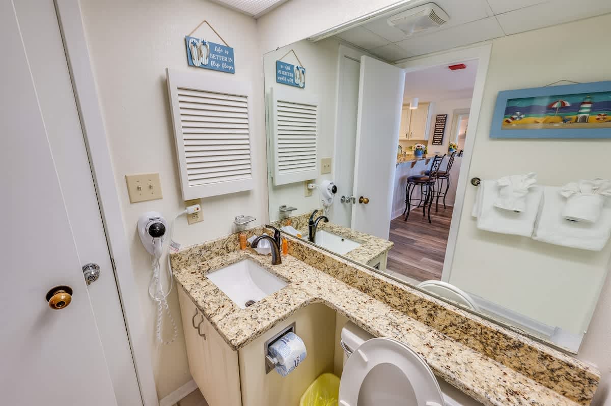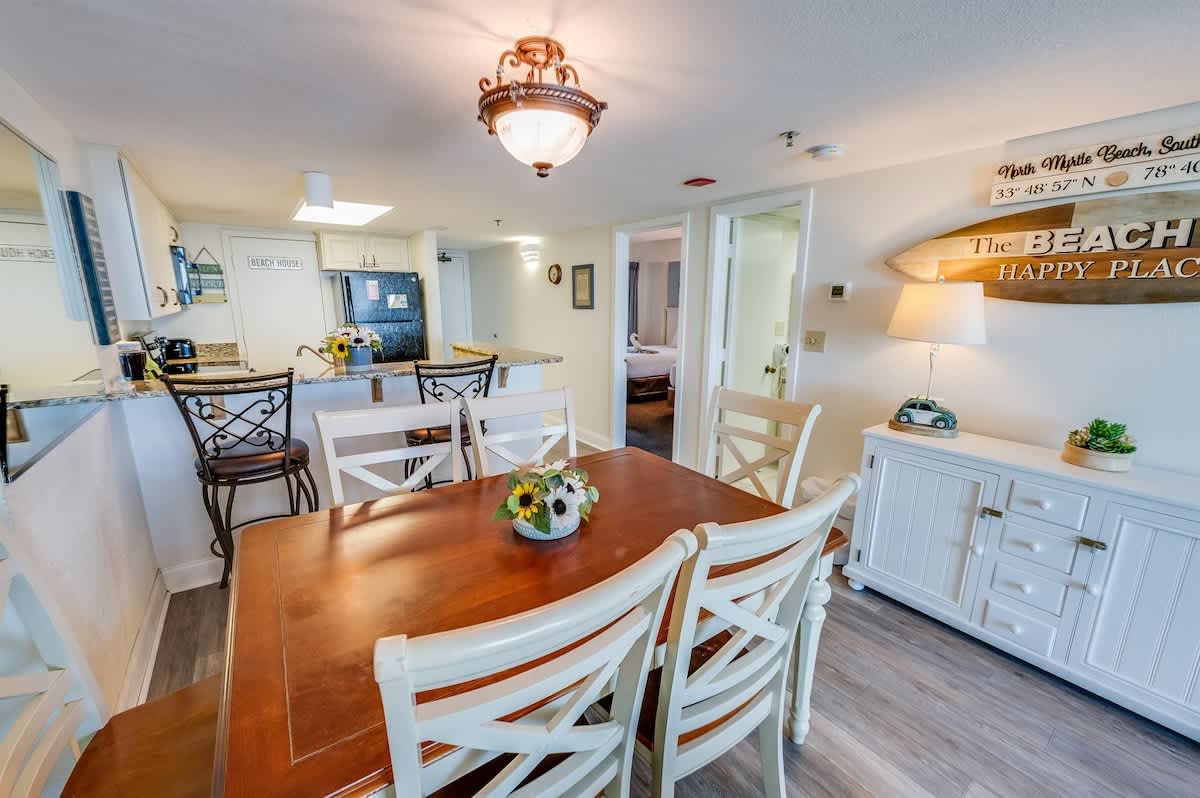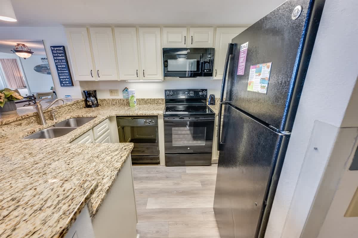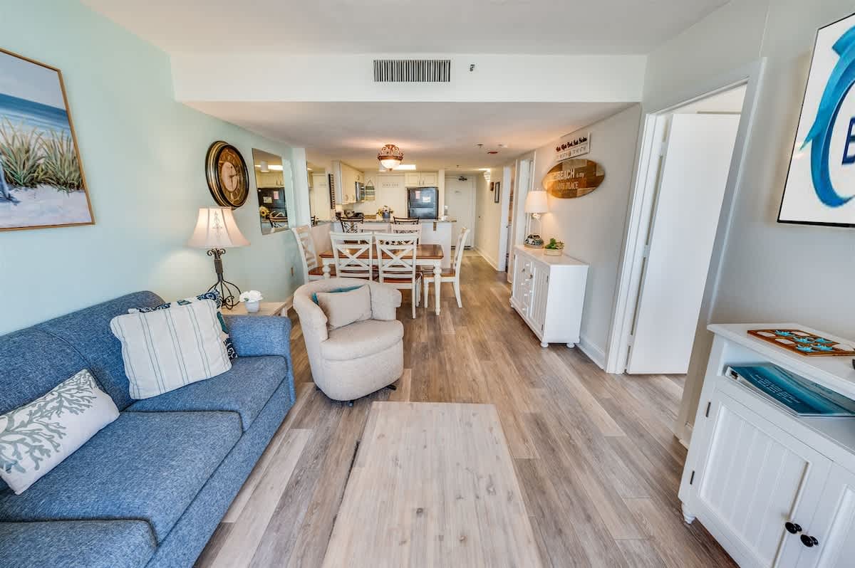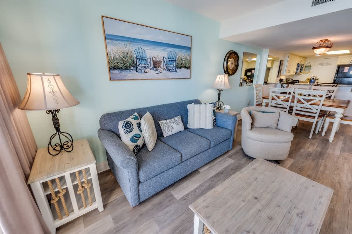 This condo features two bedrooms and two bathrooms, comfortably accommodating up to eight guests. The main bedroom includes a king bed, the guest room has two full beds, and the living area offers a sofa bed for additional sleeping space. Equipped with a stove, oven, dishwasher, and microwave, it has everything needed for cooking and entertaining. Beach Cove is ideally located near all amenities.