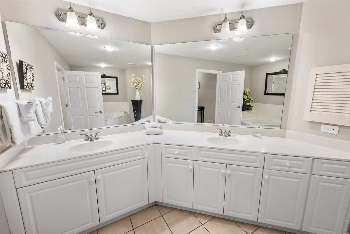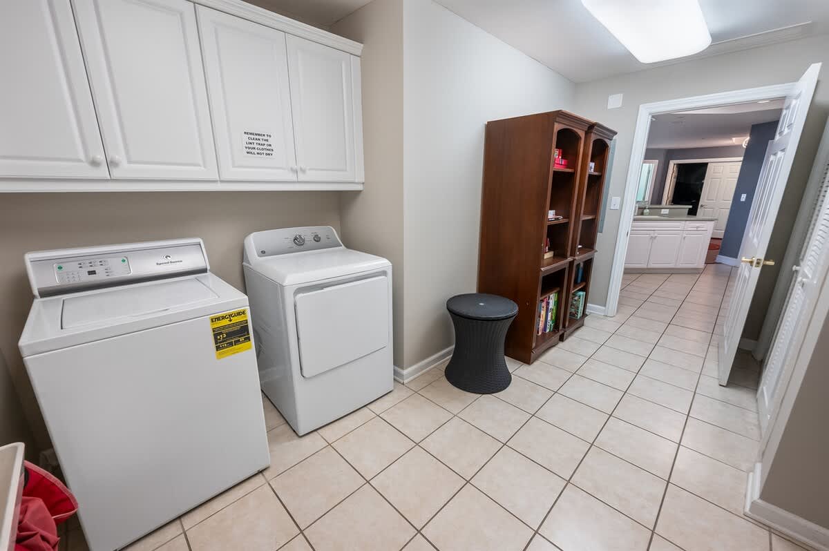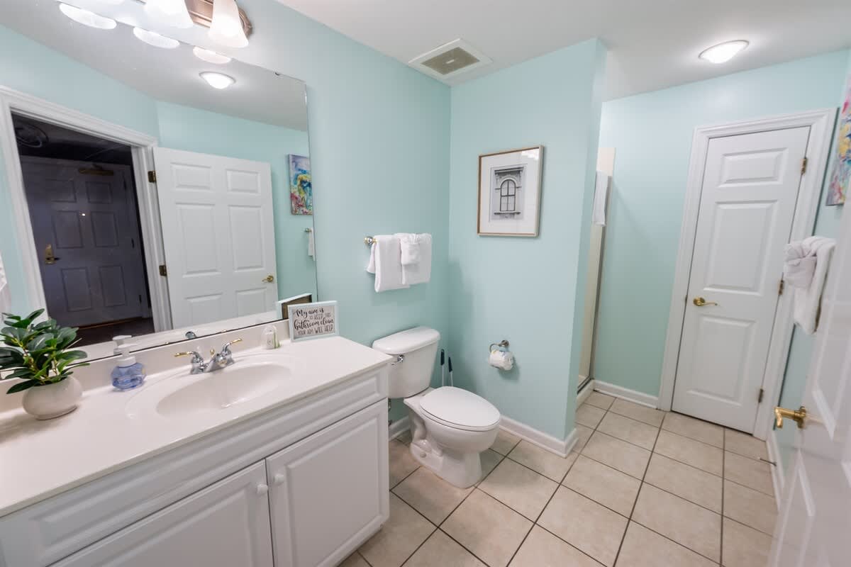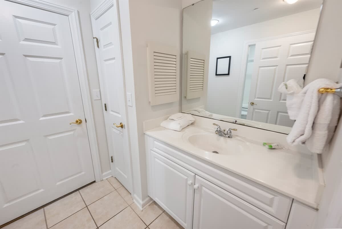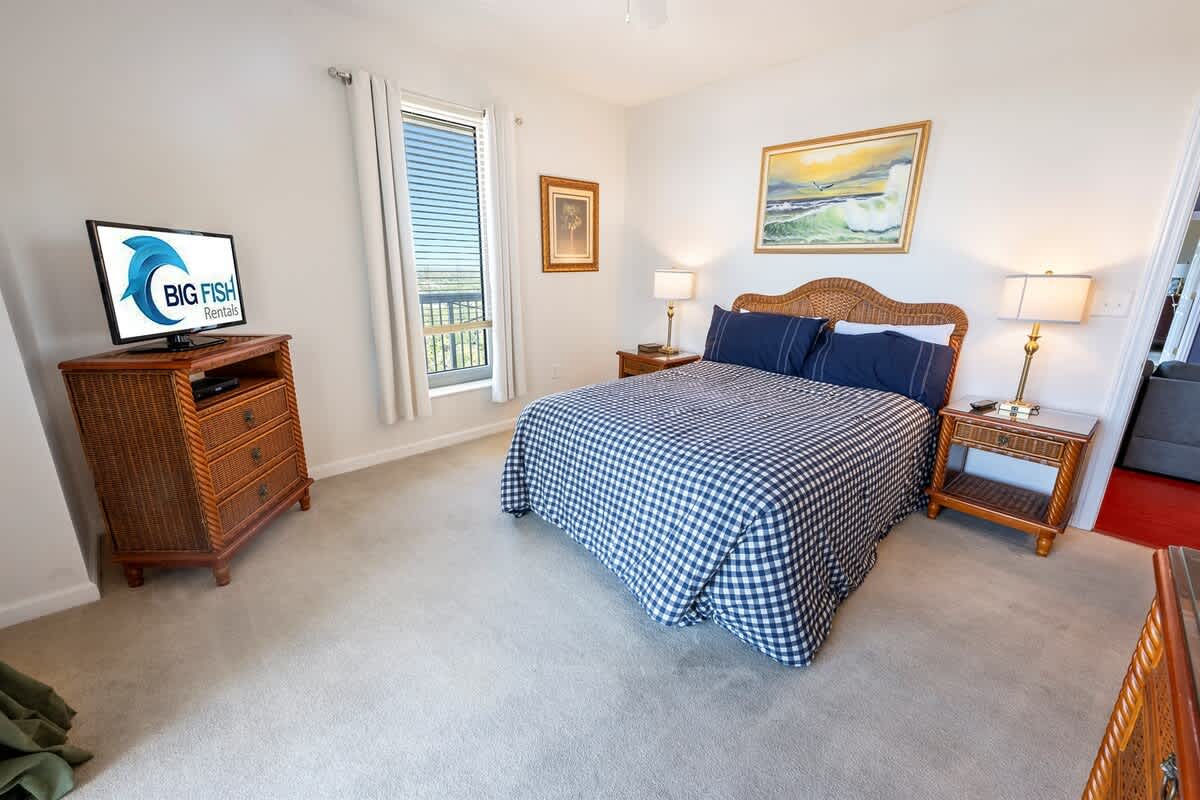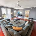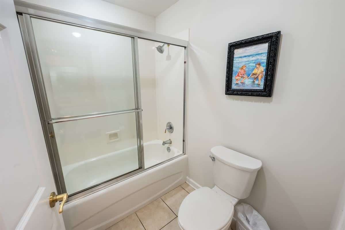 Three bedrooms provide restful retreats for up to eight guests. The main bedroom features a king-sized bed and private bathroom with a garden tub. A second bedroom also has a king-sized bed, while the third is furnished with two queen beds. Fresh linens, extra pillows, and blankets are provided, with ceiling fans to keep the coastal air circulating. Two additional full bathrooms ensure comfort and convenience for groups or families traveling together.