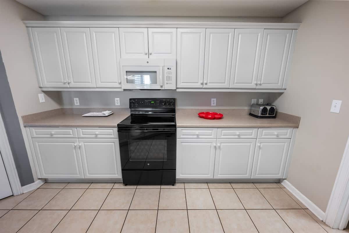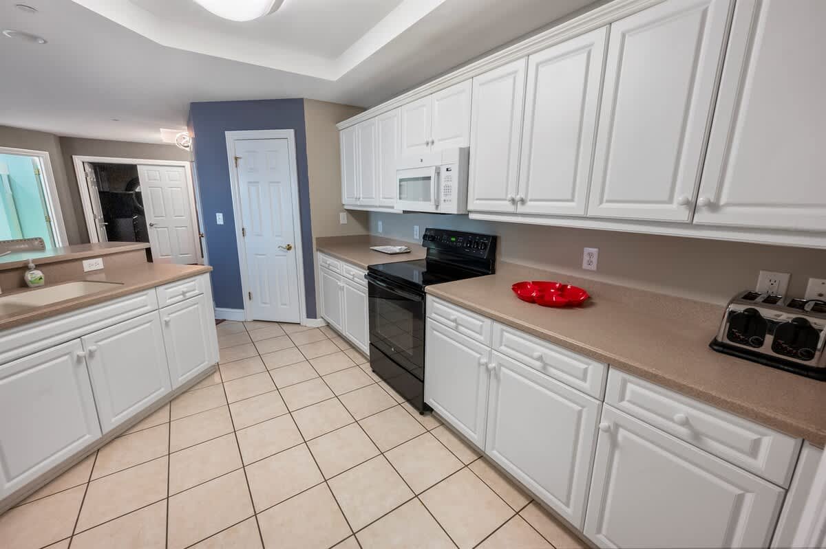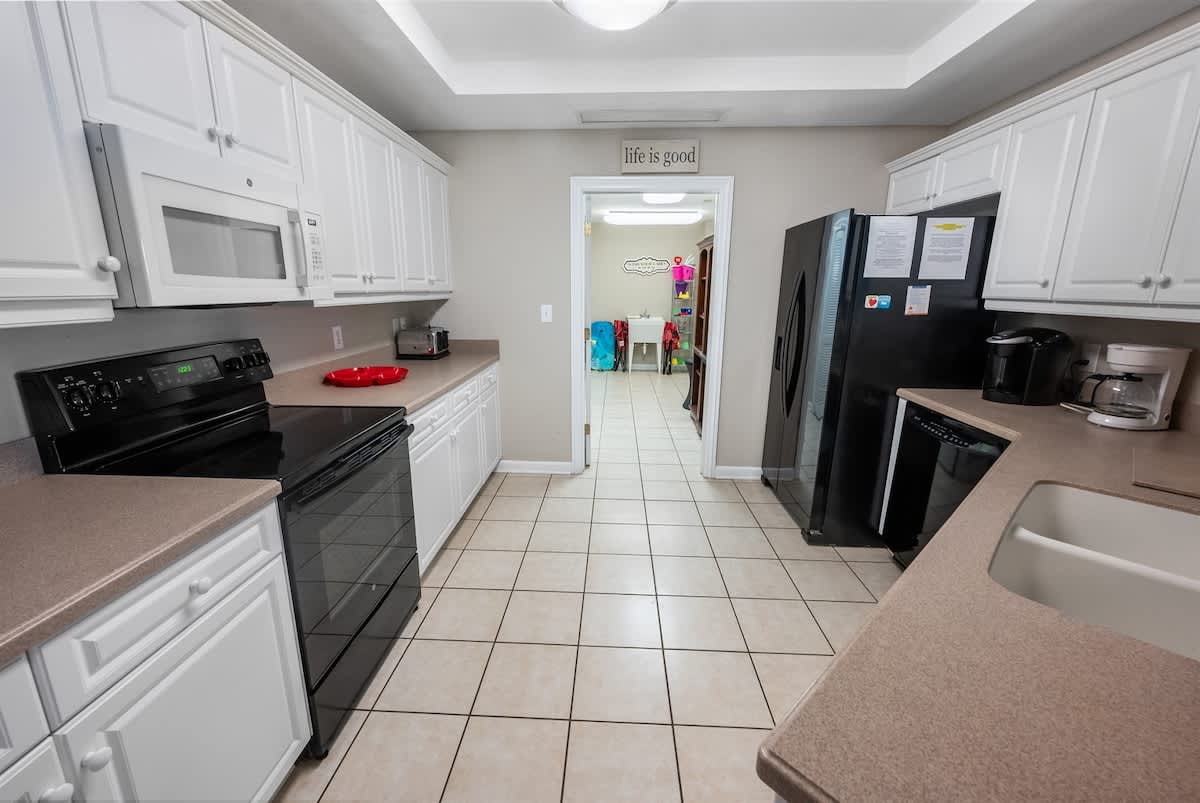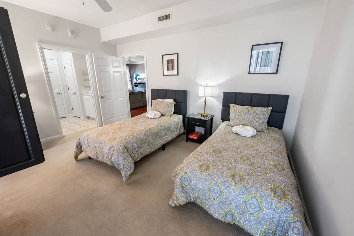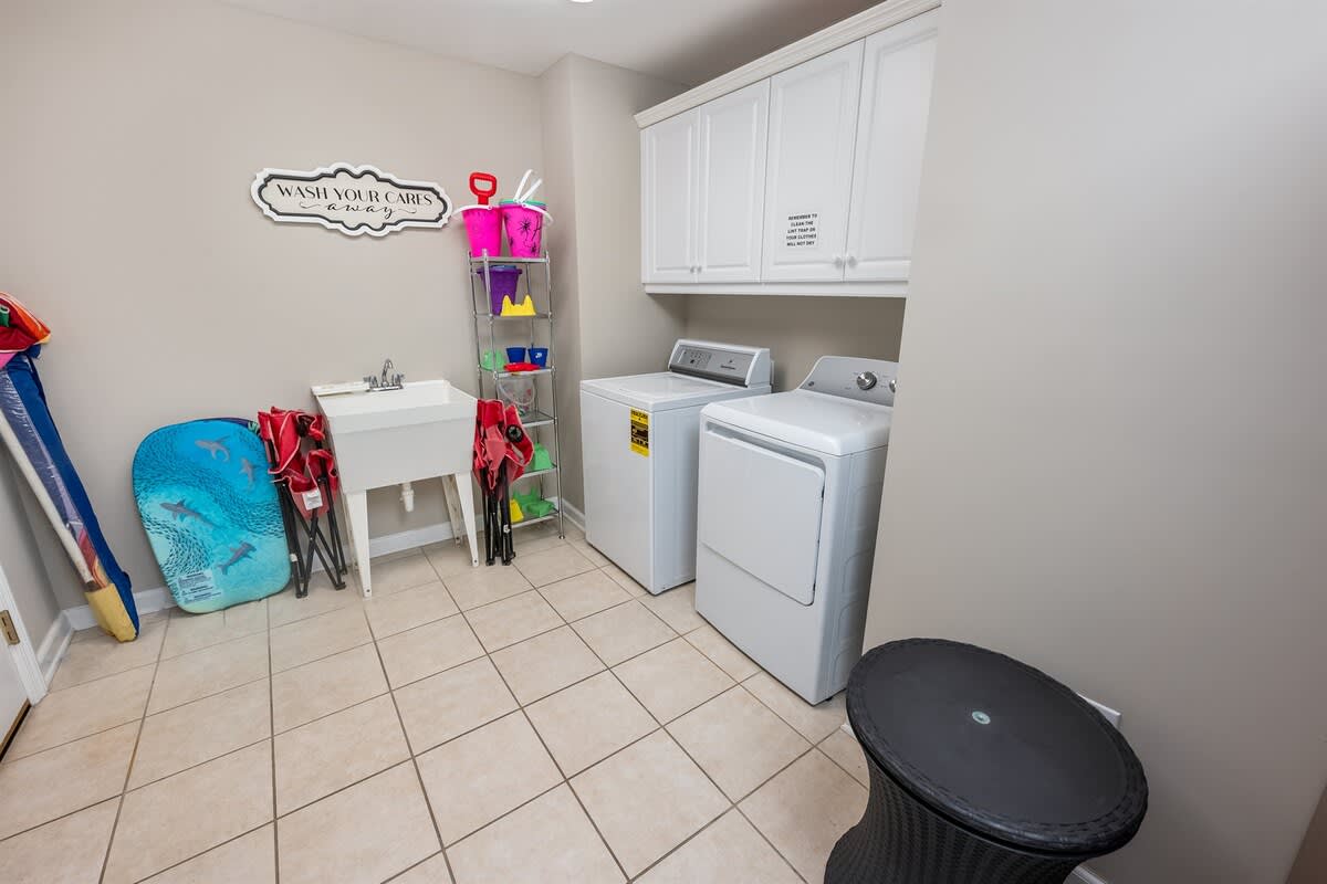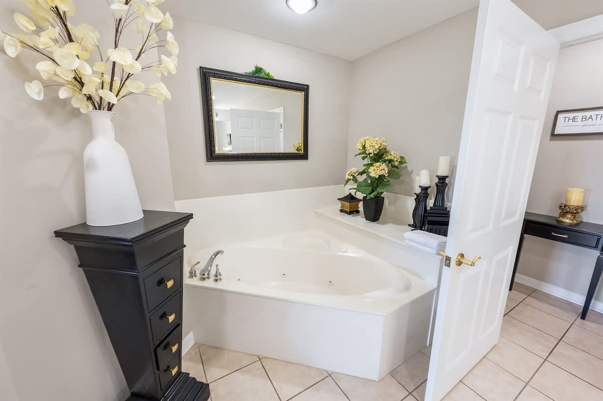 Three bedrooms provide restful retreats for up to eight guests. The main bedroom features a king-sized bed and private bathroom with a garden tub. A second bedroom also has a king-sized bed, while the third is furnished with two queen beds. Fresh linens, extra pillows, and blankets are provided, with ceiling fans to keep the coastal air circulating. Two additional full bathrooms ensure comfort and convenience for groups or families traveling together.