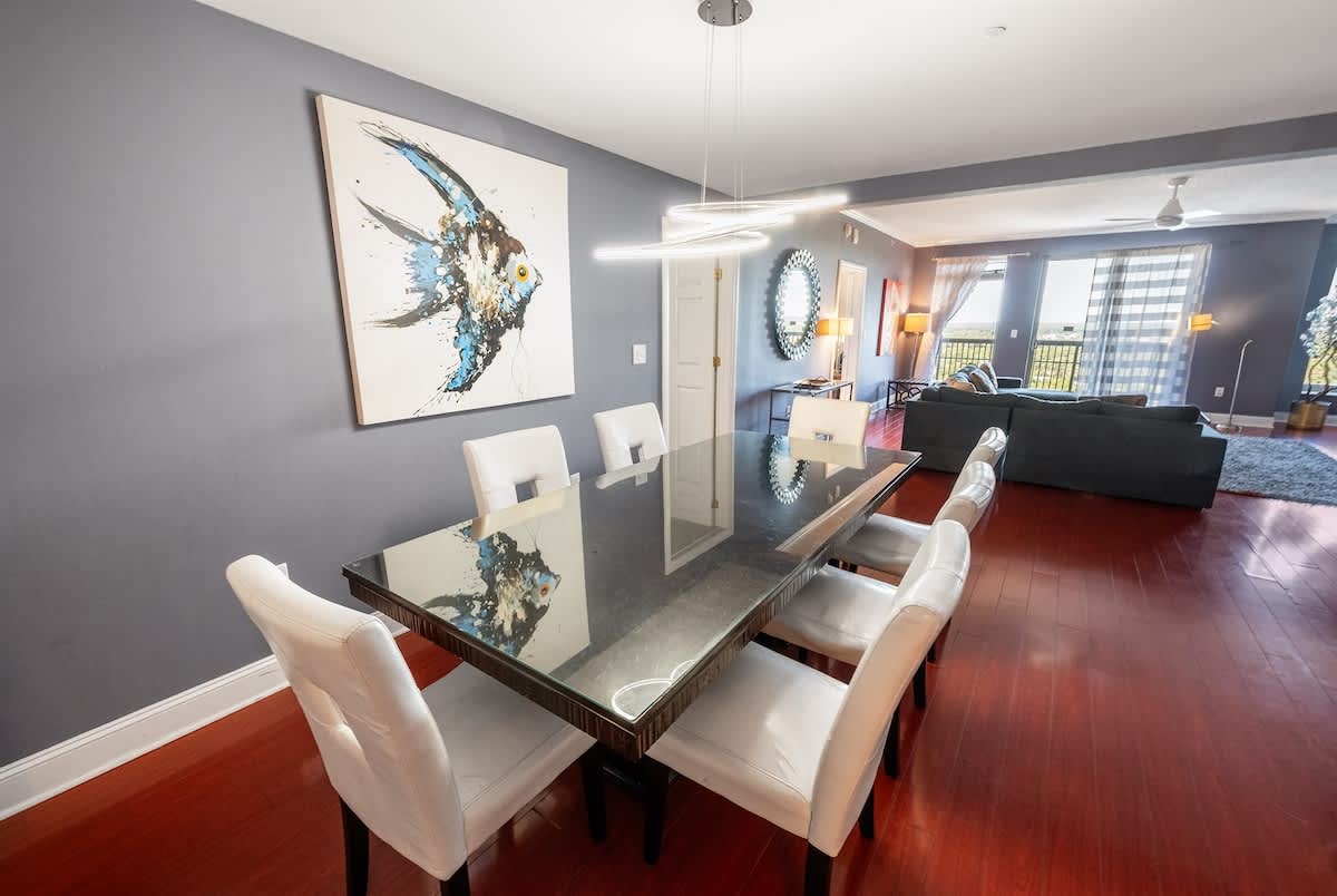 An open-concept living space creates a welcoming flow inside, with floor-to-ceiling windows framing the ocean beyond. Comfortable seating invites you to settle in front of the flat-screen TV, while the dining table offers a space for shared meals. The fully equipped kitchen includes full-size appliances, cookware, and everything you need to prepare breakfast, snacks, or a seafood dinner without leaving the condo.