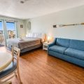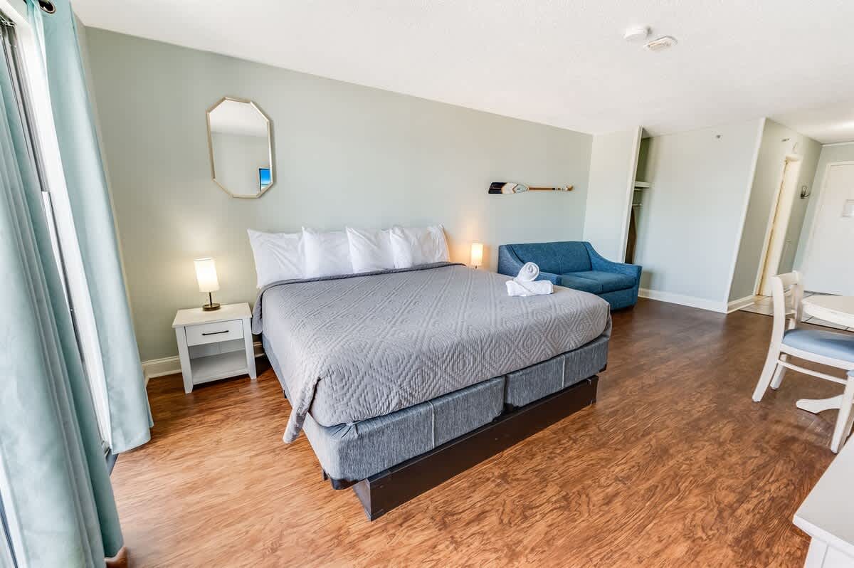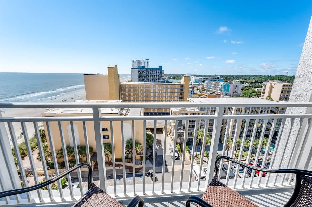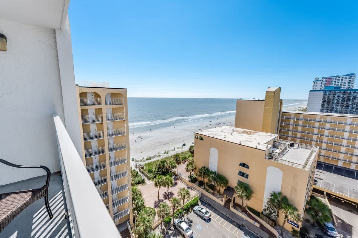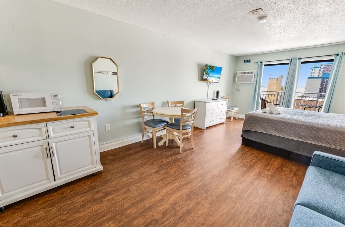 This oceanview studio has a private balcony on the 11th floor of the Sea Mist Resort. It has been recently remodeled and has new appliances, including a refrigerator and microwave. The studio has a king bed and a sofa bed, accommodating up to four people. The studio is cleaned to a high standard to ensure a comfortable and enjoyable stay.