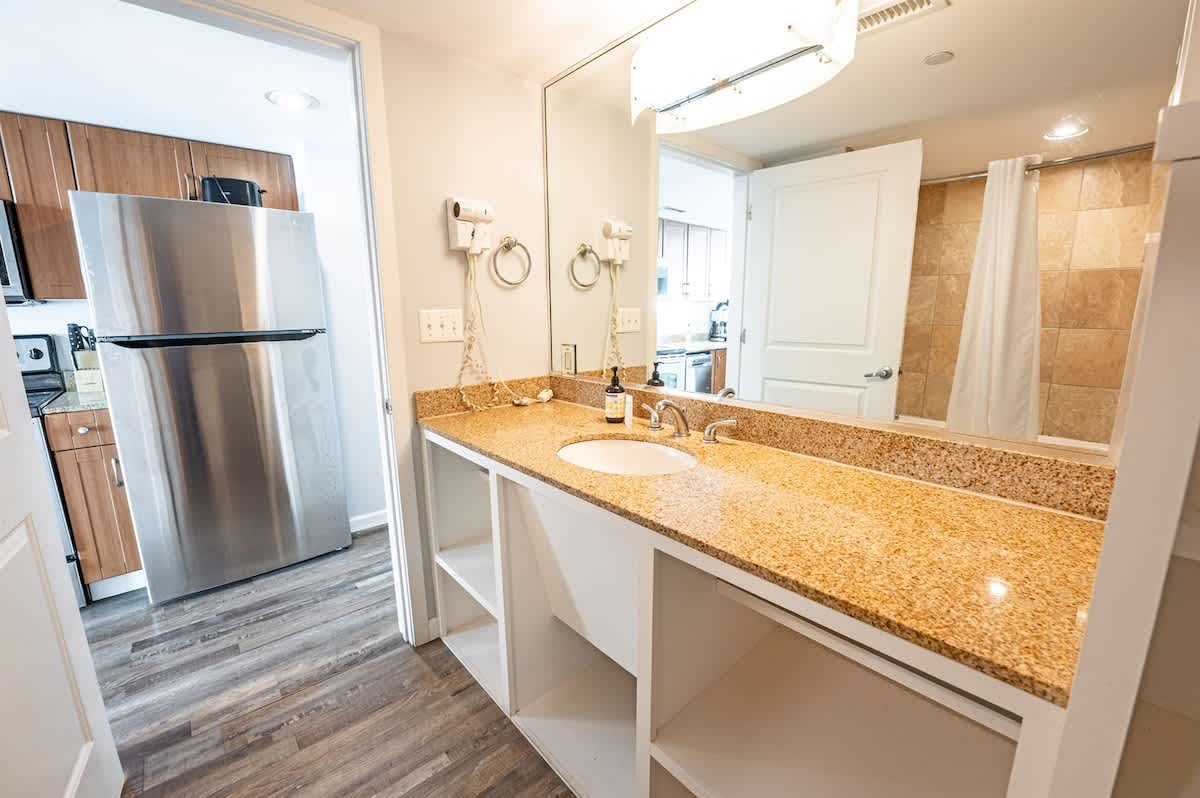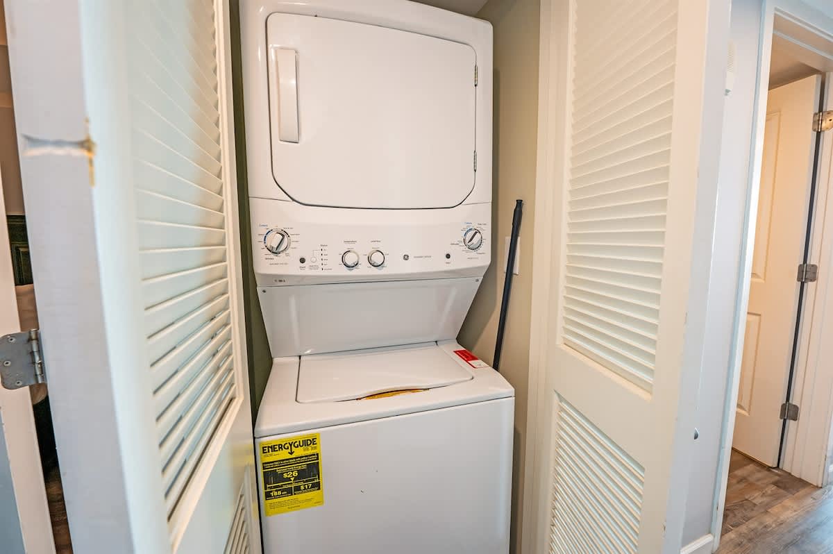A full kitchen allows you to prepare meals at your own pace, whether you’re starting the day with coffee or winding down after time by the water. The kitchen opens to a dining area for shared meals and conversation. An in-unit washer and dryer add convenience for longer stays or beach-focused trips.