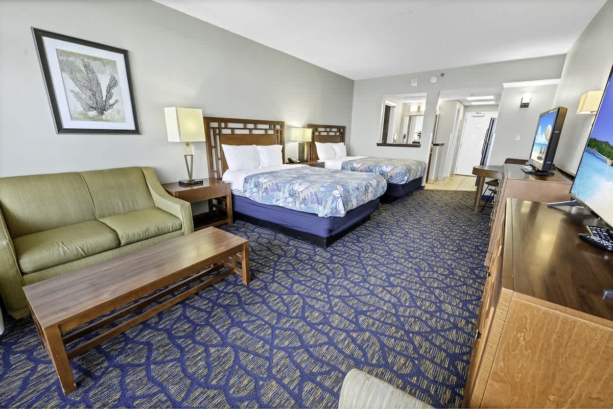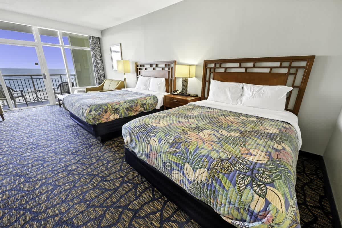 This entire beachfront condo sits directly along Myrtle Beach and comfortably sleeps up to four guests. Designed for relaxed coastal stays, the layout is simple and functional, allowing you to move easily between the living area and the outdoor patio or balcony. From inside, scenic views extend across the ocean, beach, resort grounds, and city skyline, keeping the surroundings present throughout your stay.