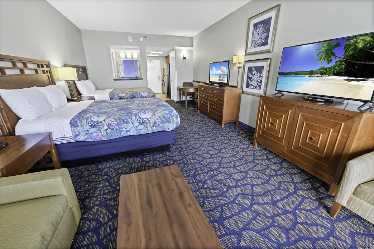The condo features one bedroom with two queen beds. Fresh bed linens, extra pillows, and blankets are provided, creating a comfortable place to unwind after long days near the water or exploring nearby attractions.