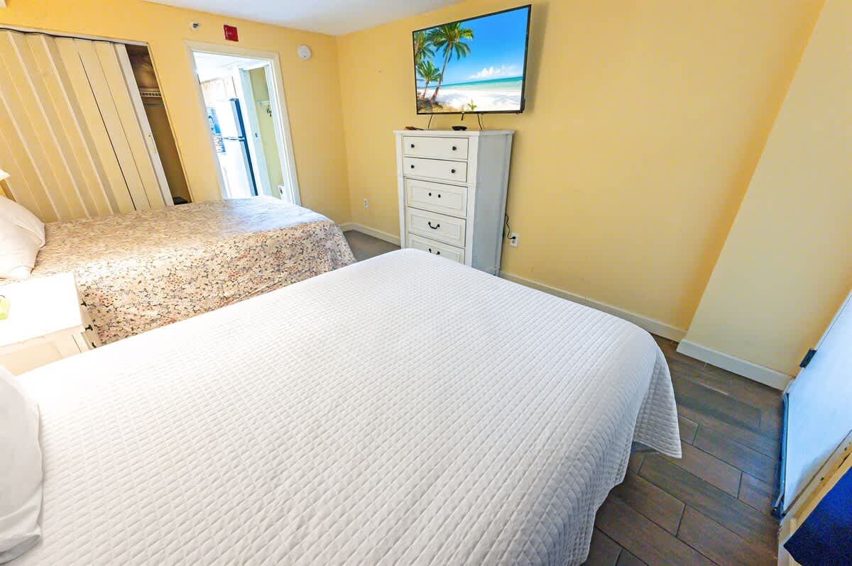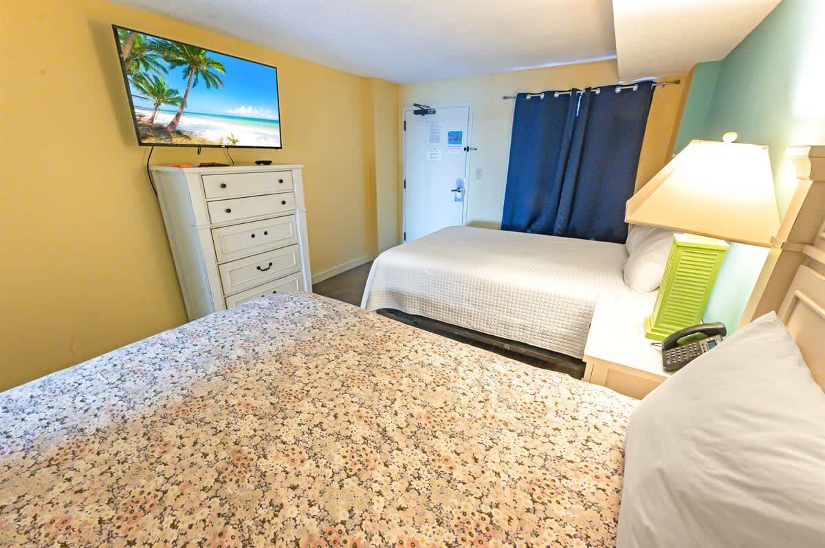 The condo sleeps up to six guests across one bedroom and additional flexible sleeping space. The bedroom features two queen beds with bed linens, extra pillows and blankets, and room-darkening shades to support restful nights. A floor mattress in the living area provides extra sleeping space when needed.