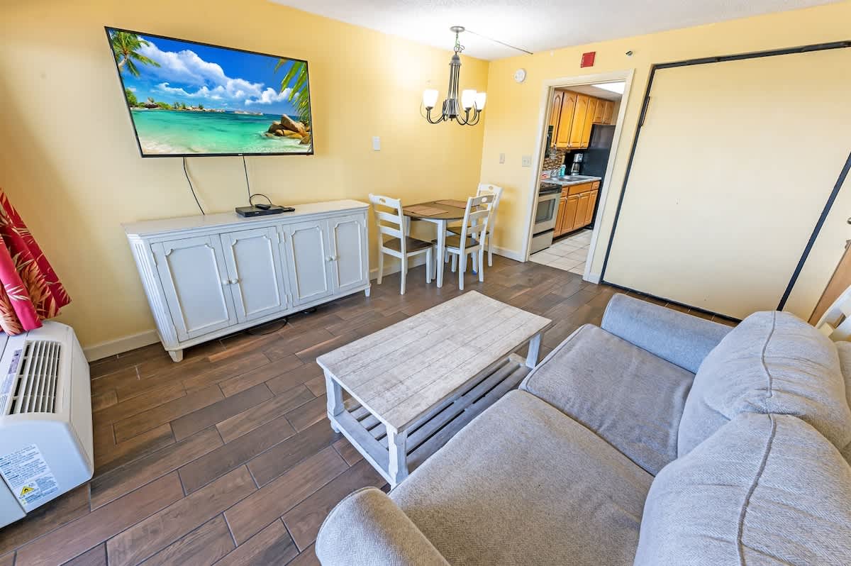 Air conditioning and heating keep the condo comfortable year-round. WiFi and a dedicated workspace allow you to stay connected, while bathroom essentials, towels, and linens are provided for convenience. Free parking on the premises and free street parking are available during your stay.