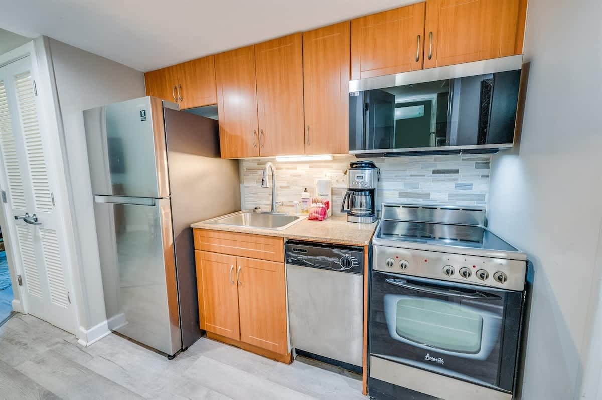 The condo is equipped with WiFi, TV, air conditioning, and heating. For peace of mind, the unit includes a smoke alarm, fire extinguisher, and first aid kit. Self check-in with a smart lock allows for a smooth arrival.