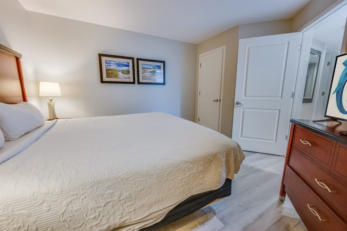 The condo sleeps up to six guests. A king bed anchors the main sleeping area, while a sofa bed and a Murphy bed provide additional sleeping options. Bed linens, extra pillows, and blankets are provided to help everyone get comfortable.