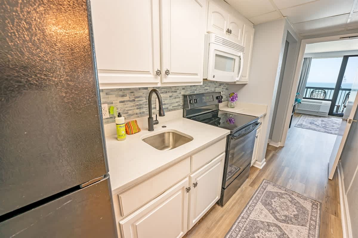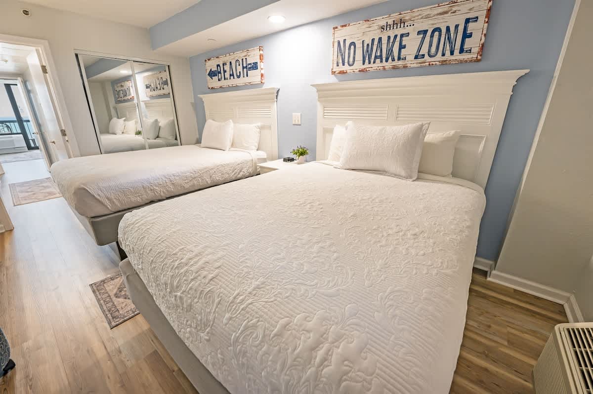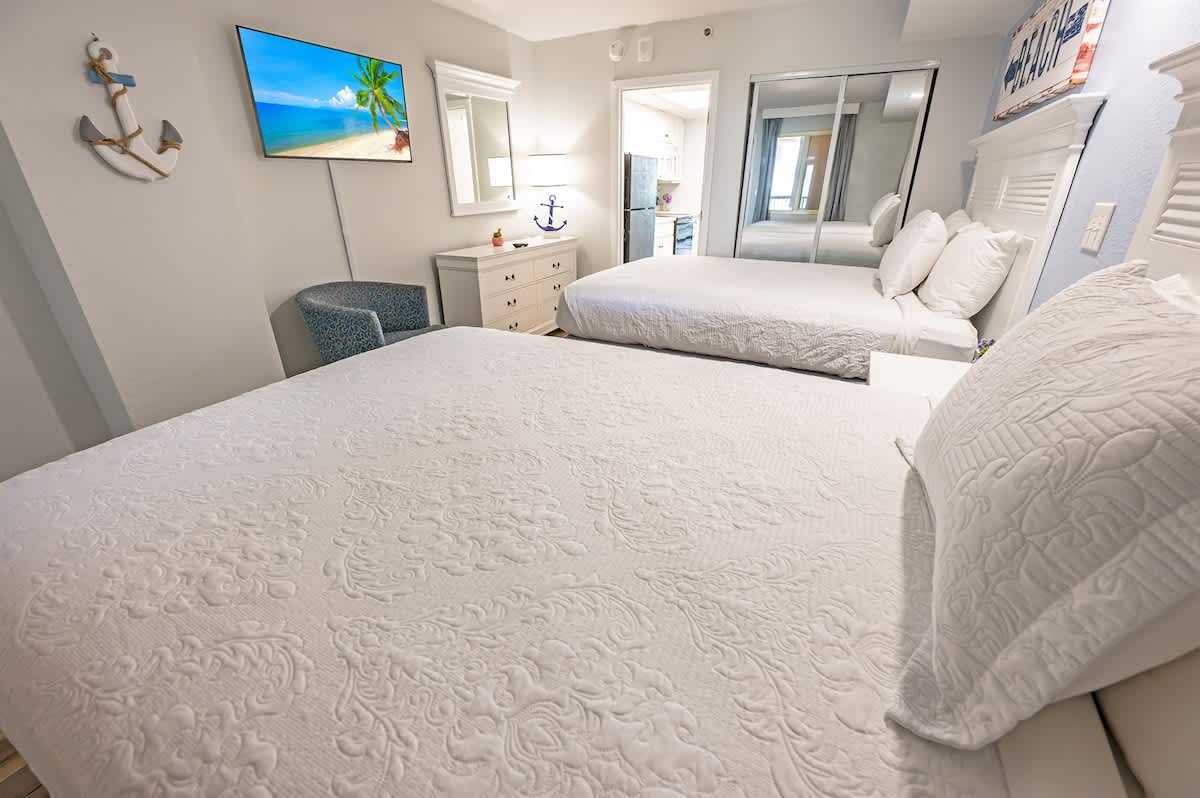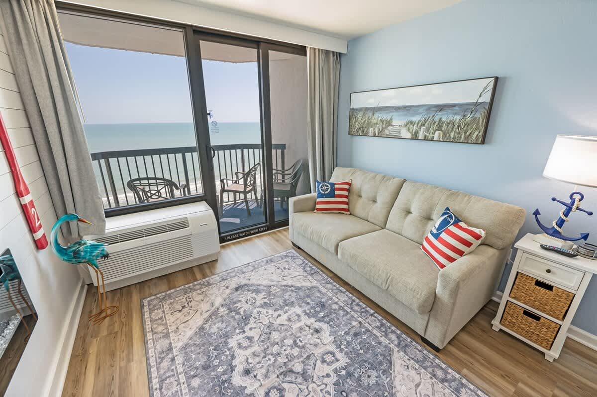 Our beachfront condo features 2 Queens, and 1 Murphy fold-down bed, a private bathroom, and full-sized appliances. This beachfront condo sleeps up to 6. Enjoy the morning sunrise on your private oceanfront balcony overlooking the beautiful ocean. Amenities include, but are not limited to: a large kiddie fun activity pool area, 3 lazy rivers, 7 hot tubs, 2 outdoor pools, 1 indoor pool, and more! Great available unit in a fantastic resort!