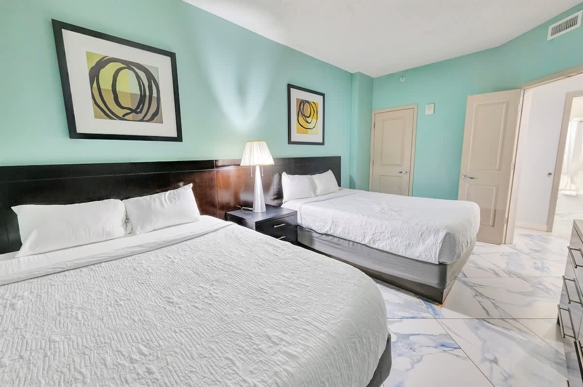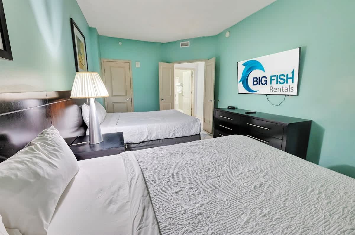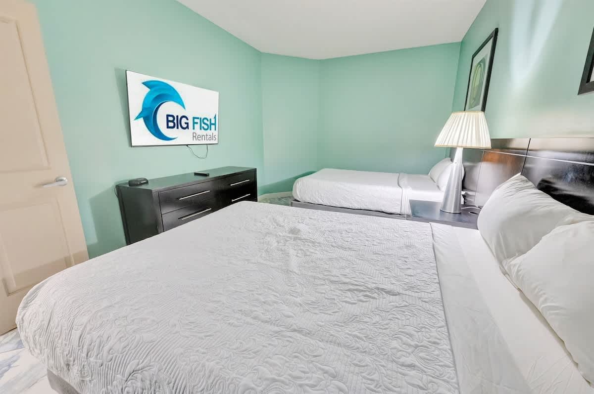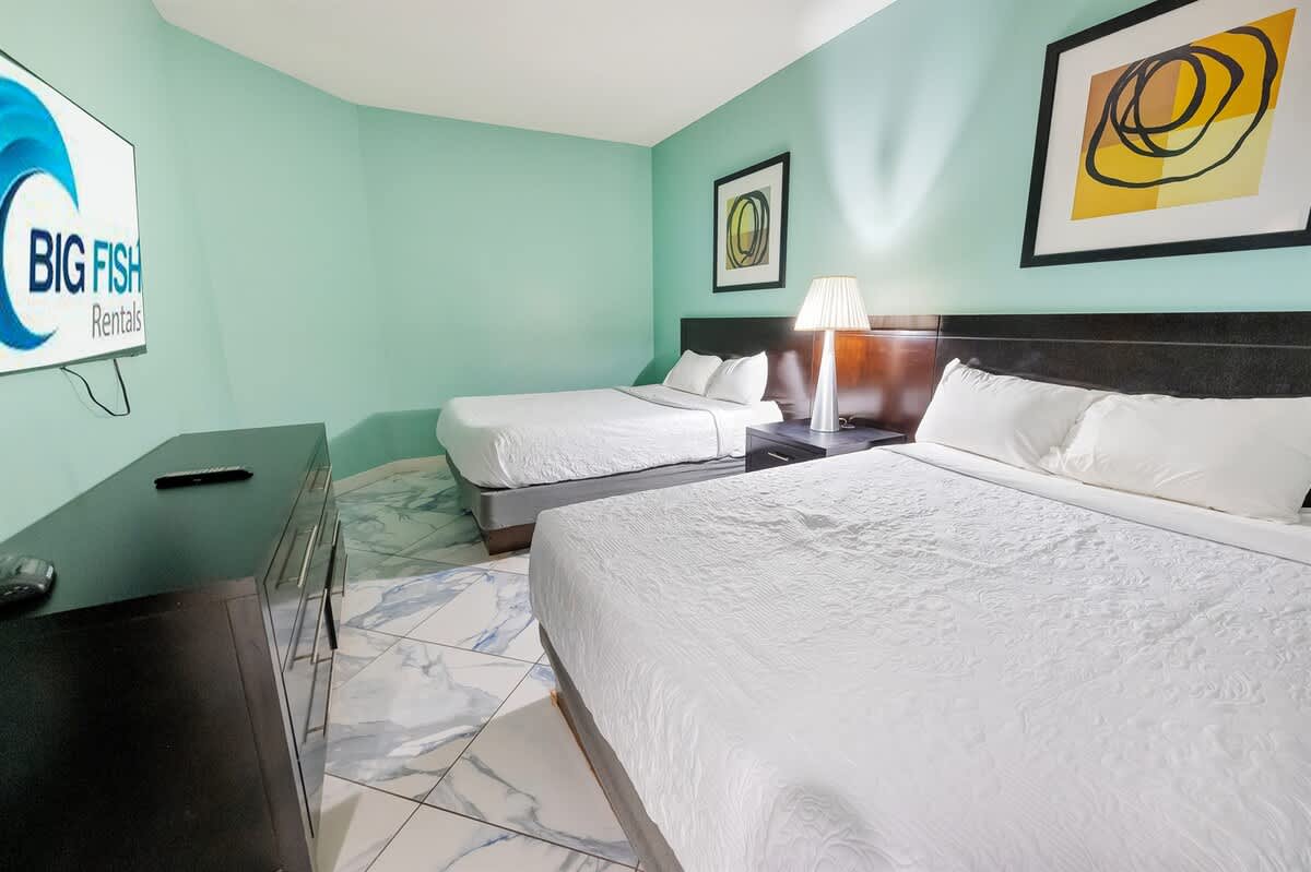 The condo features two bedrooms and two full bathrooms. The primary suite has a king bed and private bath; the second bedroom includes two queen beds. Everyone gets room to relax.