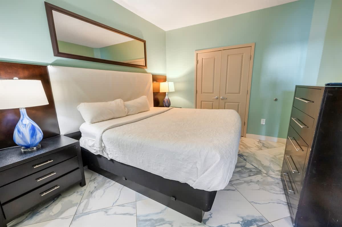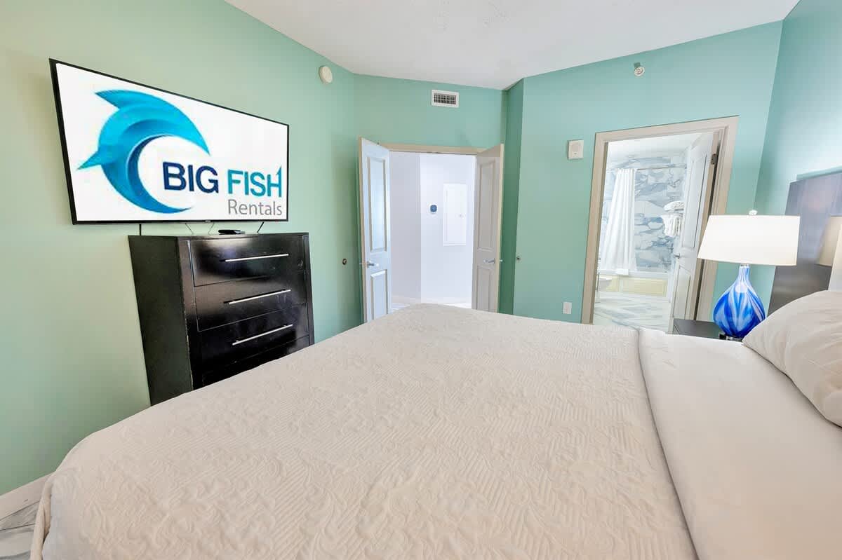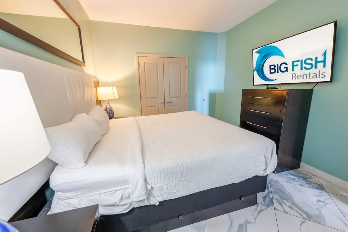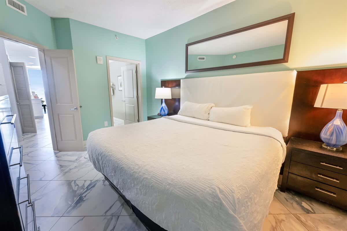 The condo features two bedrooms and two full bathrooms. The primary suite has a king bed and private bath; the second bedroom includes two queen beds. Everyone gets room to relax.