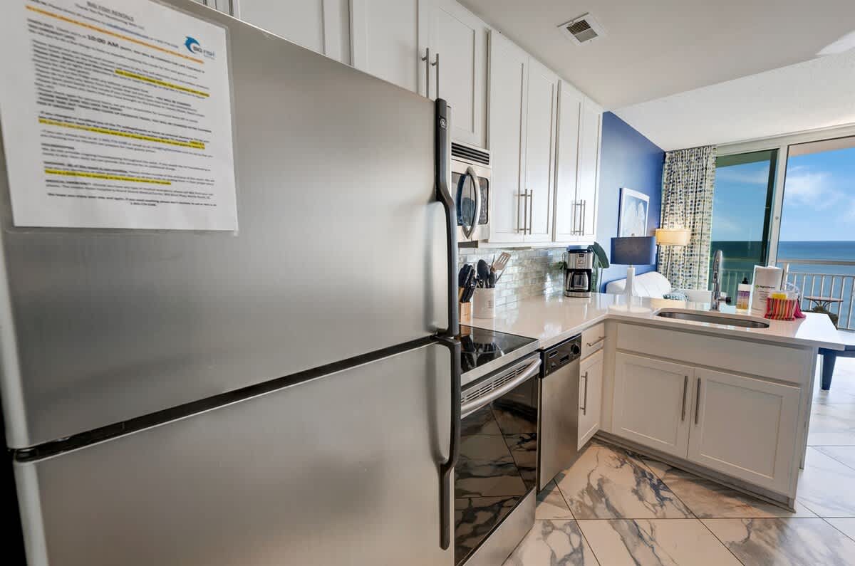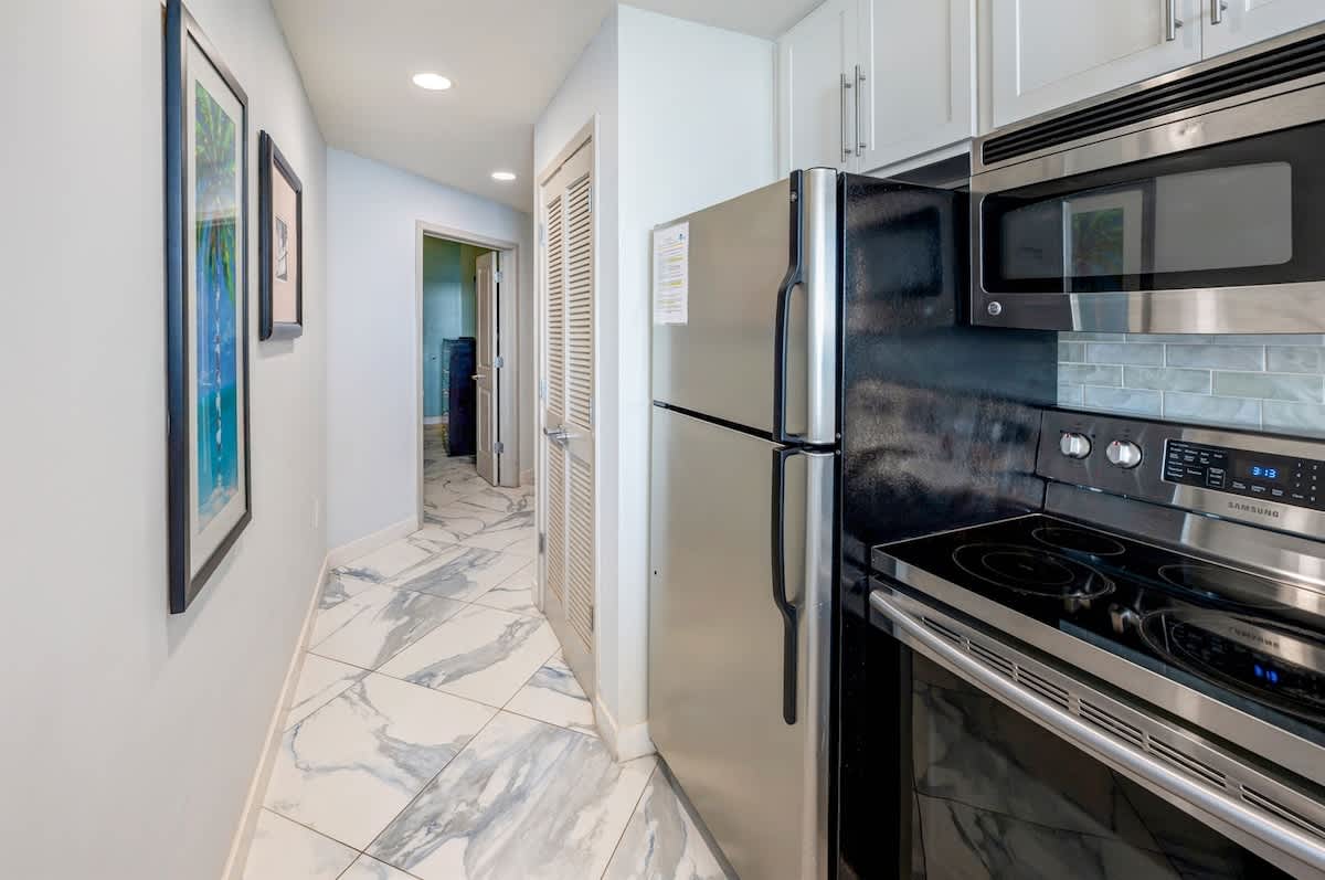A full kitchen allows you to prepare meals during your stay, whether it’s a quick breakfast before heading out or a shared dinner back at the condo. There’s space to dine indoors at the table, or you can step onto the balcony and enjoy meals with the ocean just beyond the railing.