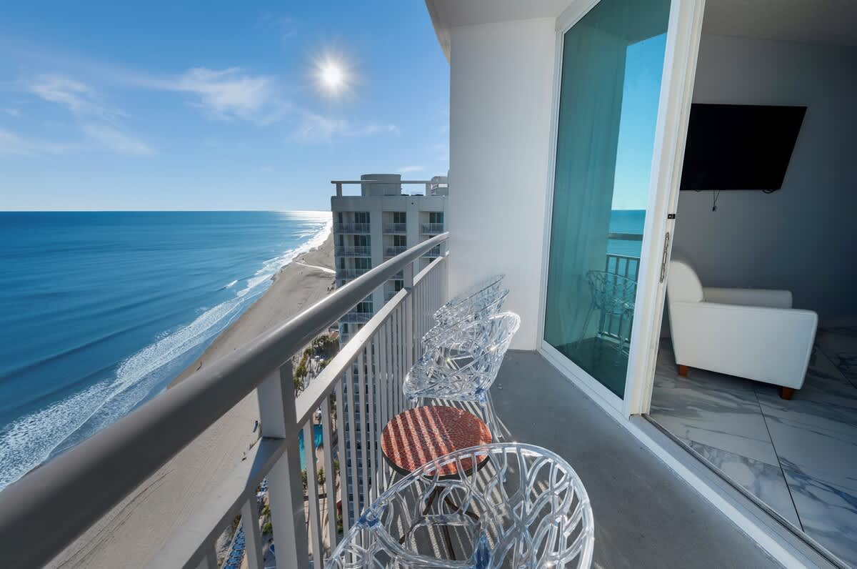 Soft light shifts across the Atlantic as waves roll steadily toward shore, their rhythm carrying up to the 19th floor. You wake to the ocean stretching wide beyond the glass, salt air drifting in through the balcony doors, and the sense that the day can unfold at an unhurried pace shaped by water and sky.