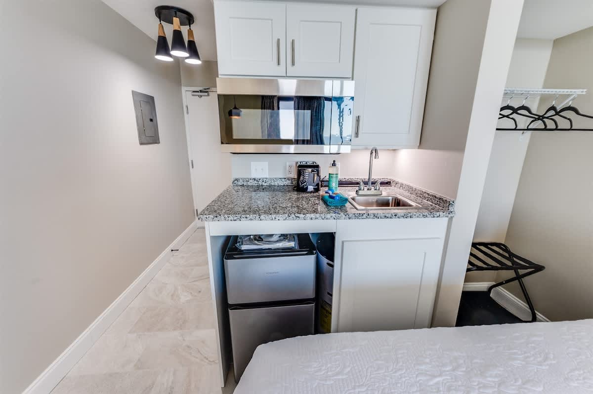 The private bathroom is located to the left of the entryway, followed by the bedroom’s two beds and a small refrigerator. The balcony has a little table and a view of the ocean. The balcony’s breathtaking views of the ocean provide the ideal atmosphere for your morning coffee or late cocktails. Enjoy the comfort of having your own kitchen in this apartment with a microwave and small refrigerator.
