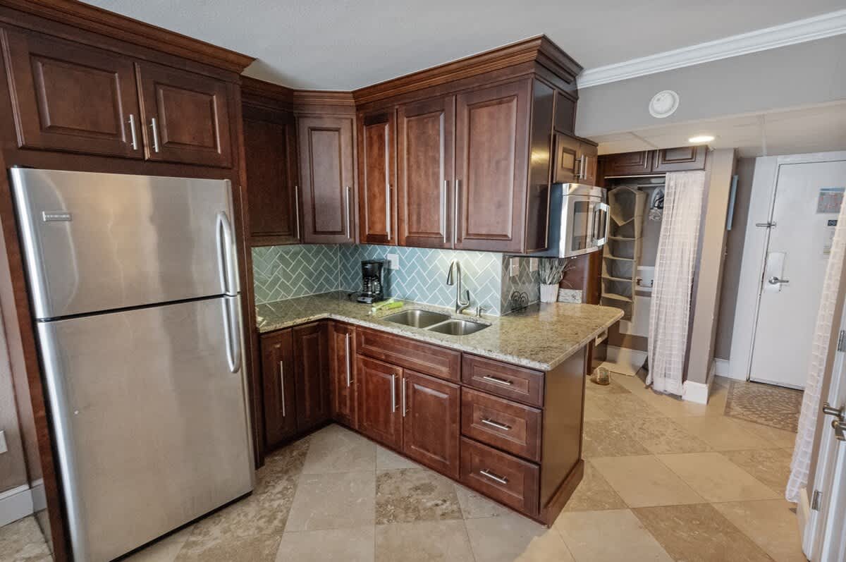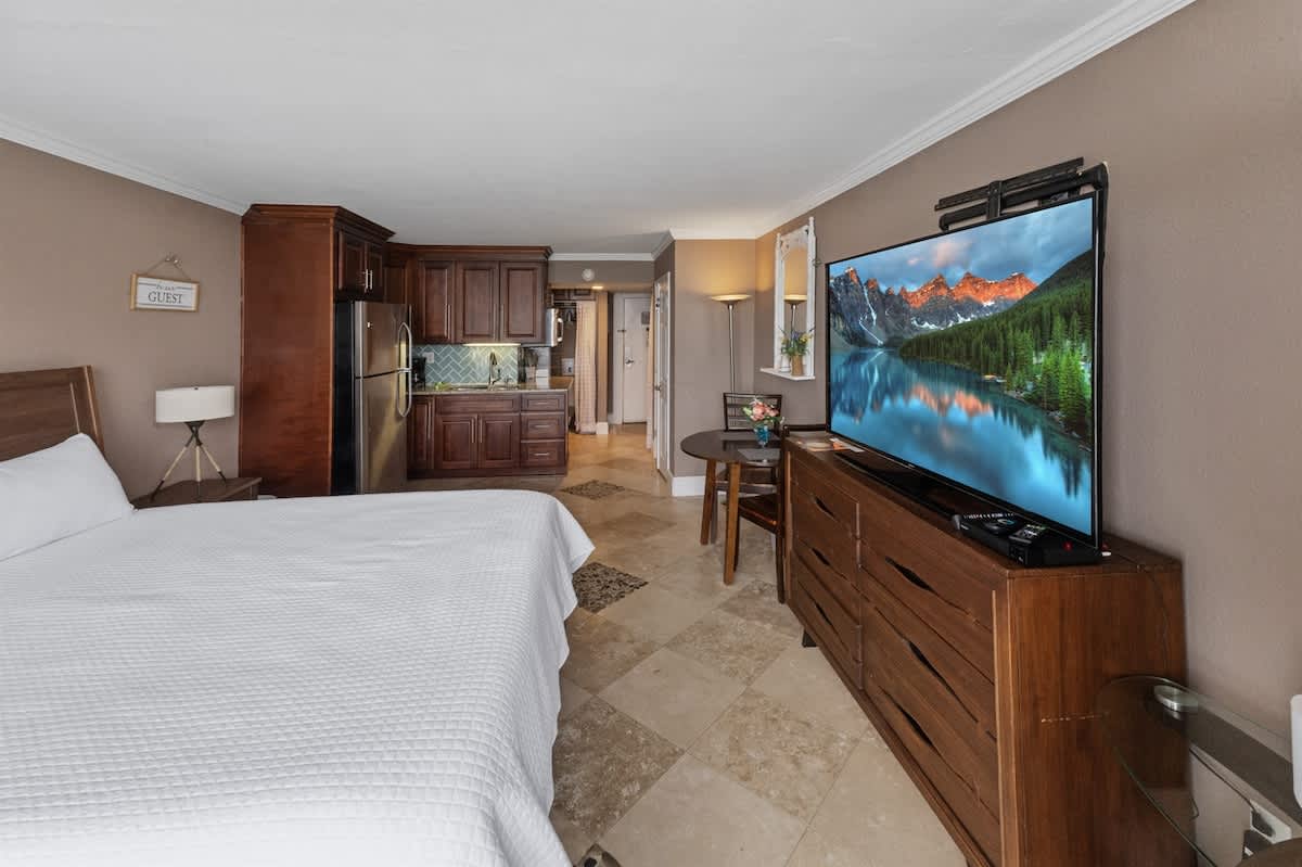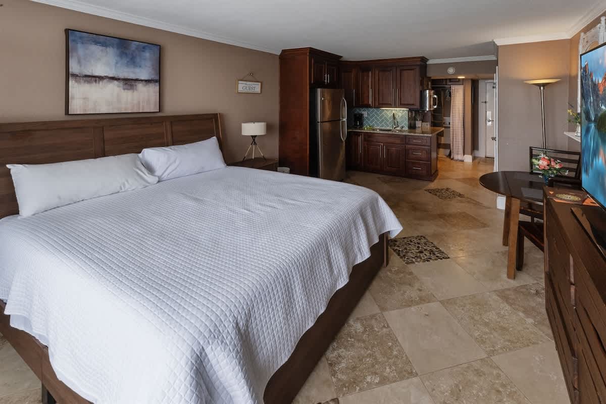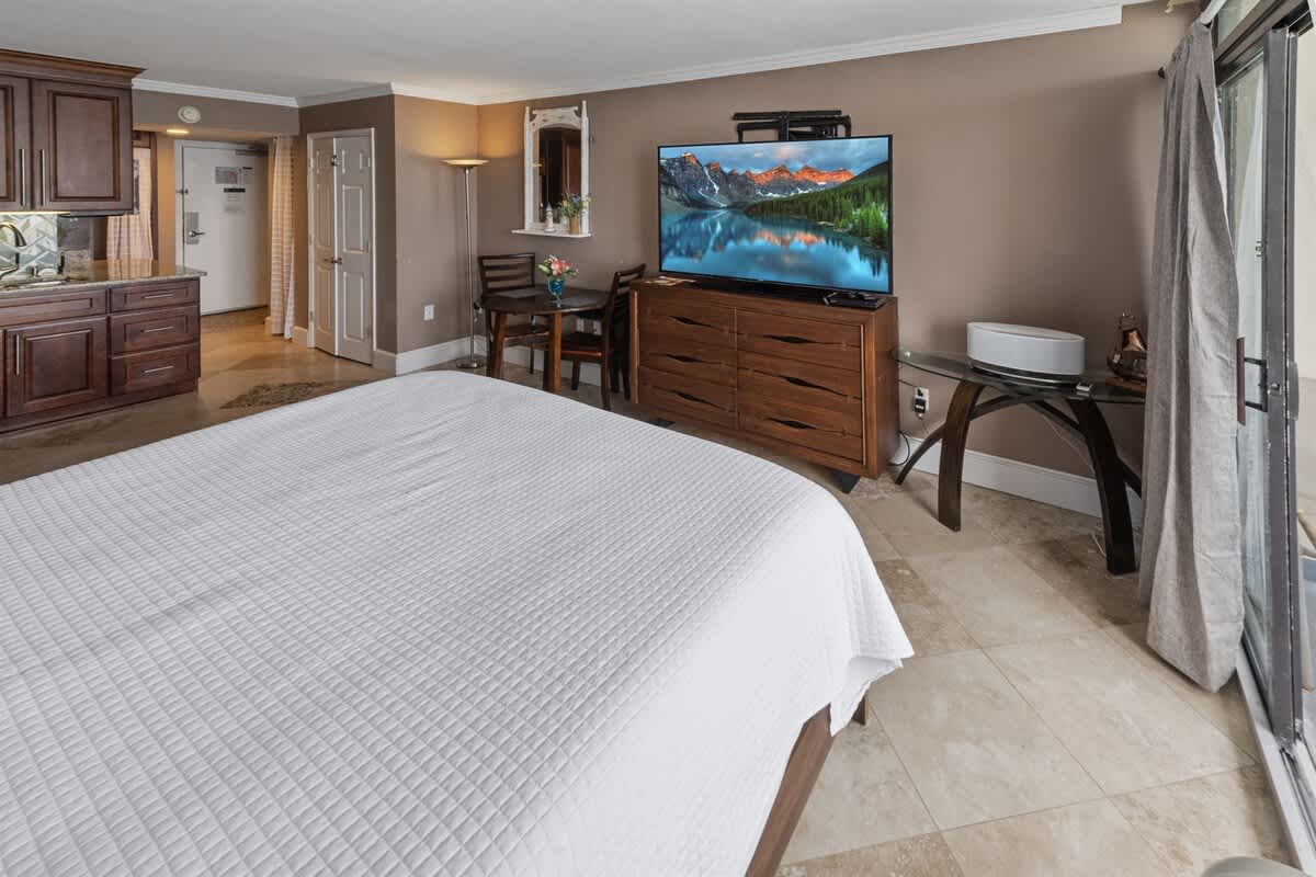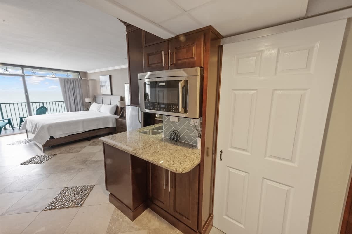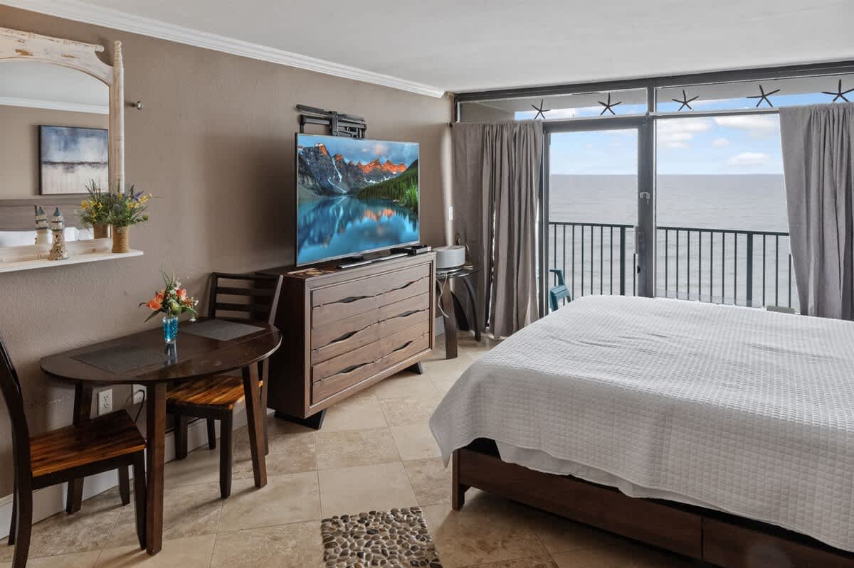This condo is located on the 10th floor of the Sand Dunes Resort. It has a private balcony, a king bed, and sleeps up to two guests. It has been recently remodeled and includes a new LCD TV, refrigerator, and microwave. The condo has high-speed Wi-Fi, a high standard of cleaning, and free onsite parking. The resort has indoor and outdoor pools, a lazy river, and hot tubs. indoor pool and spas are heated. Please note that motorcycles are not allowed in the resort’s parking.