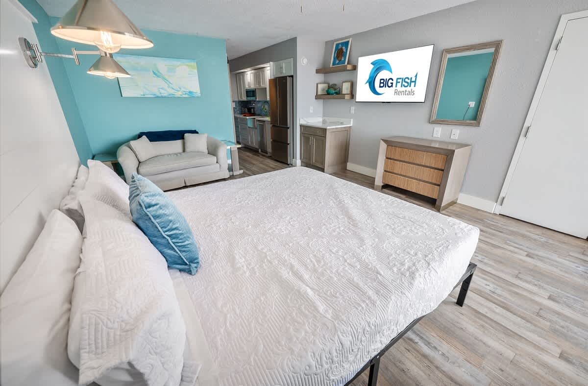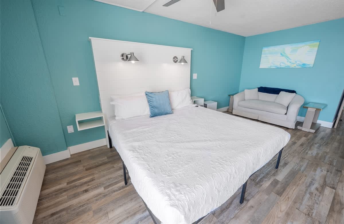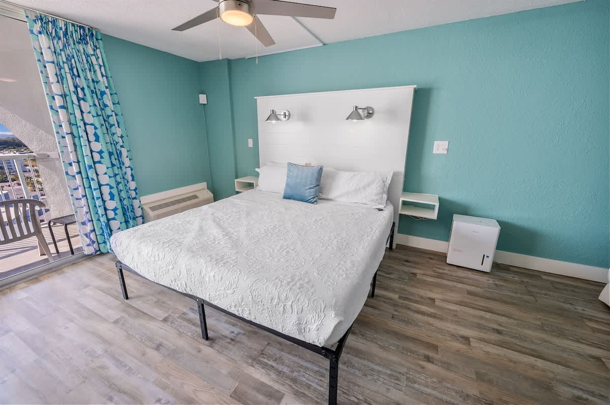 – 1 KING bed, sleeps up to 2 (sheets provided)