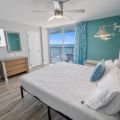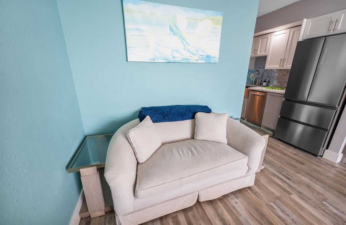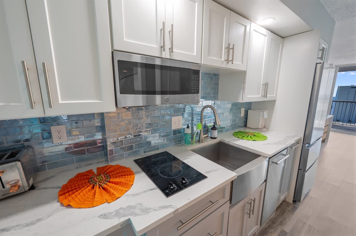 Once you enter through a foyer, you will pass through the kitchen and enter the oceanview bedroom that leads to the balcony. The balcony offers amazing ocean views and is the perfect setting for your morning coffee or evening cocktails. The unit features its own kitchen with a stove, microwave, and fridge.