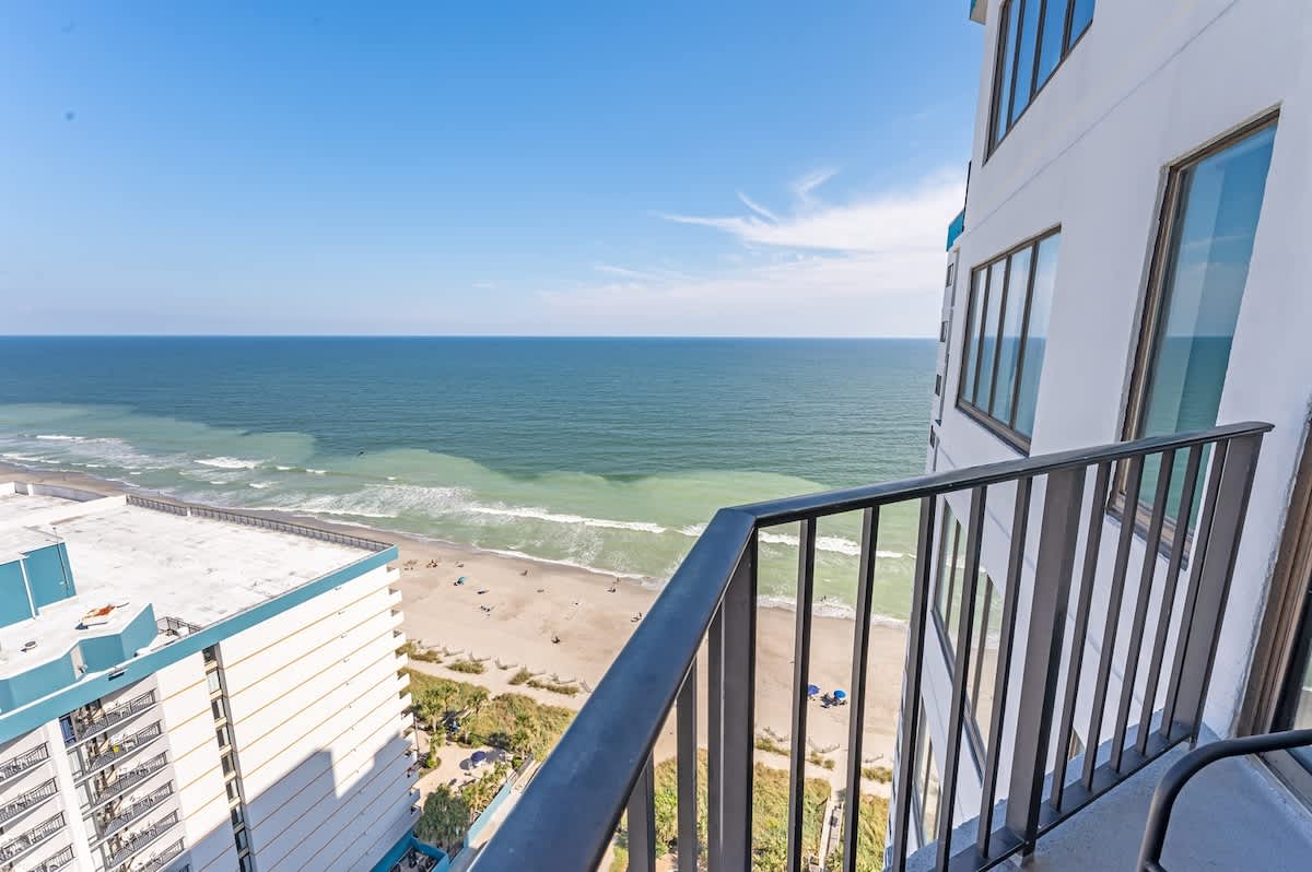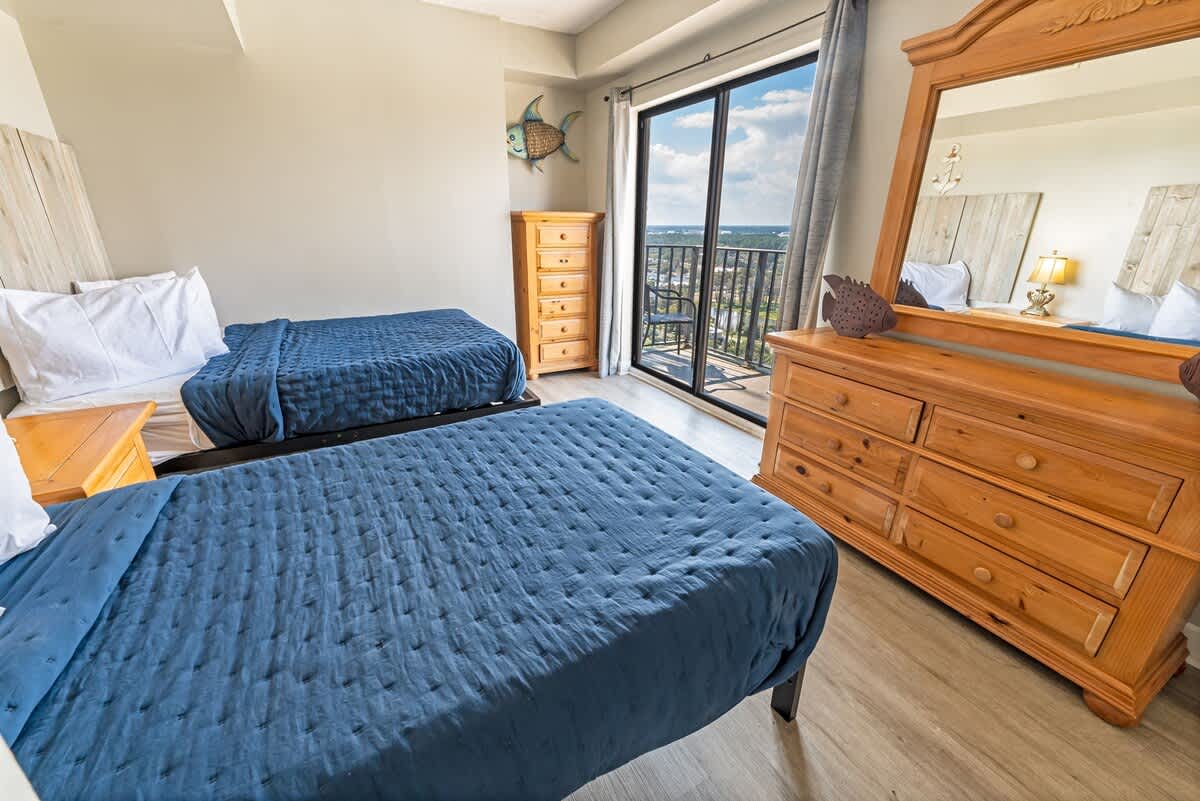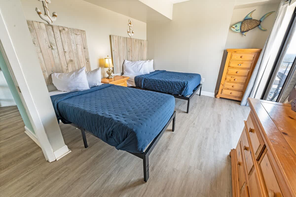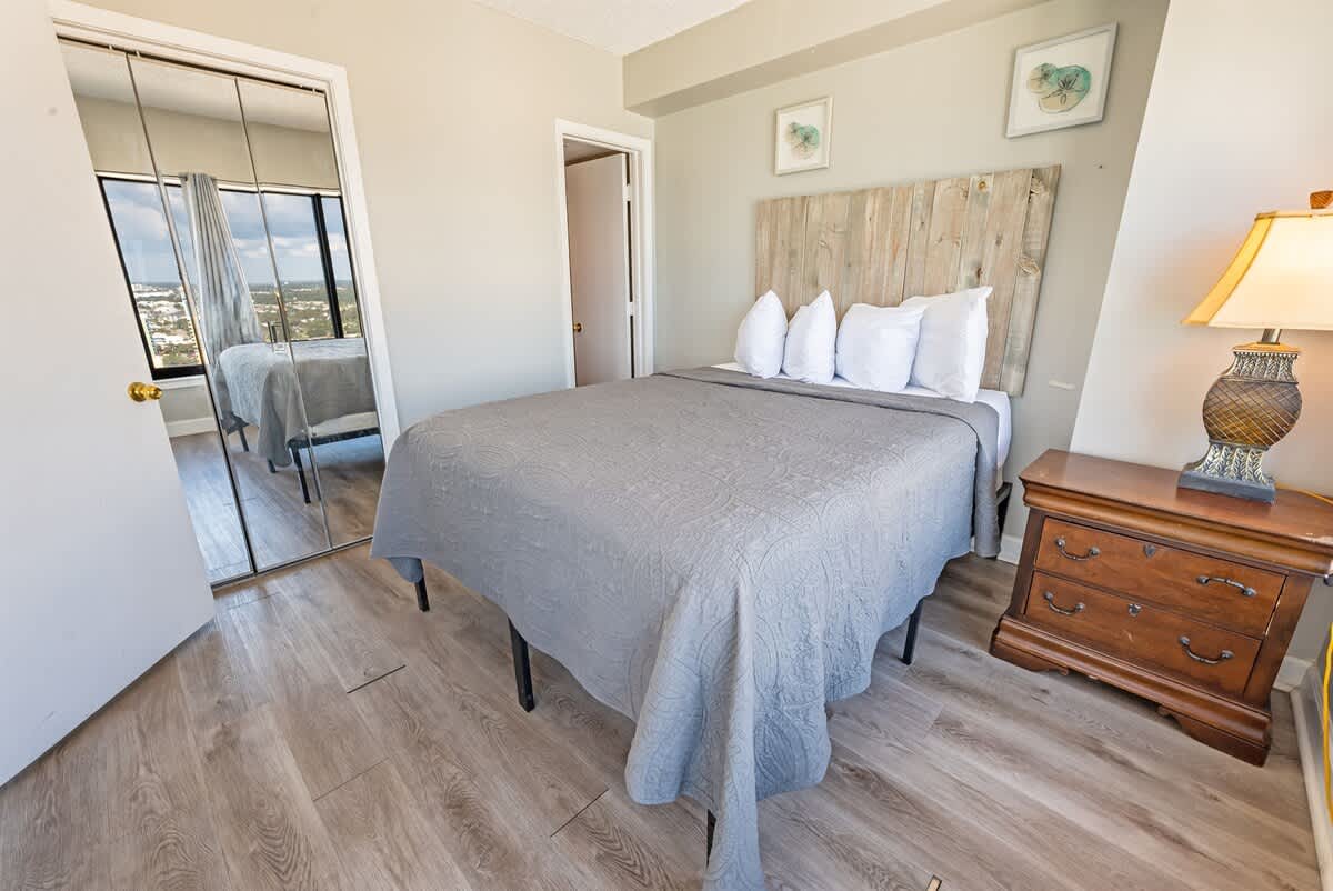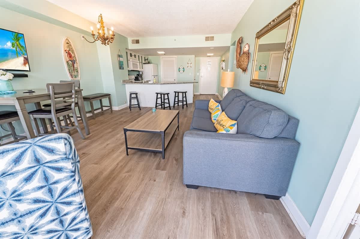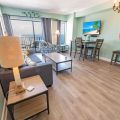 This two-bedroom, two-bathroom condo on the 22nd floor of the Palace Resort has a private balcony and is uniquely located in the resort. It has a large living room area, a queen bed, a twin bed, and a full bed, and can sleep up to five guests. The condo has beautiful flooring and decor, granite countertops, and a fully equipped kitchen with a table. It also has high-speed Wi-Fi, a high standard of cleaning, and free onsite parking. The sofa is not a sleeper sofa.