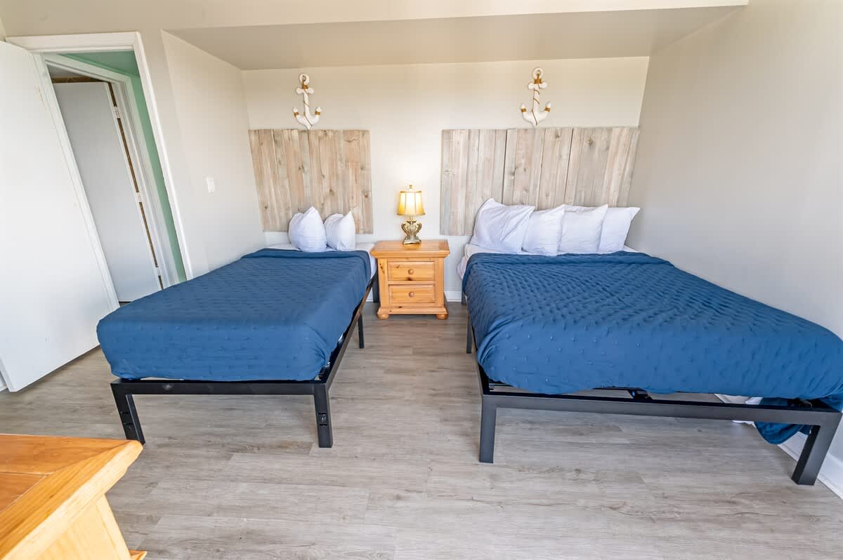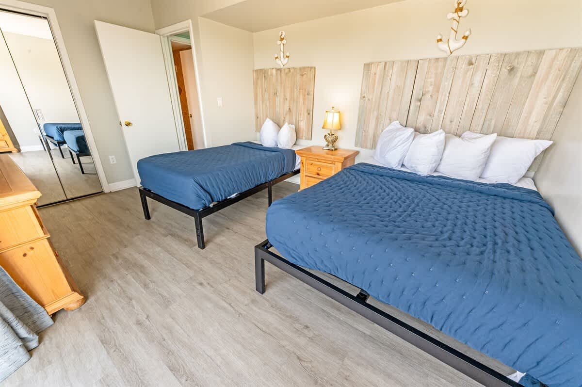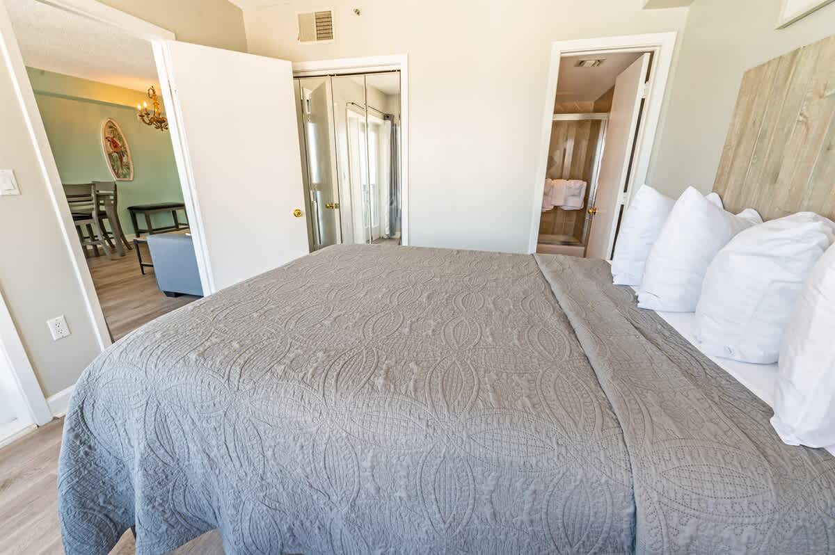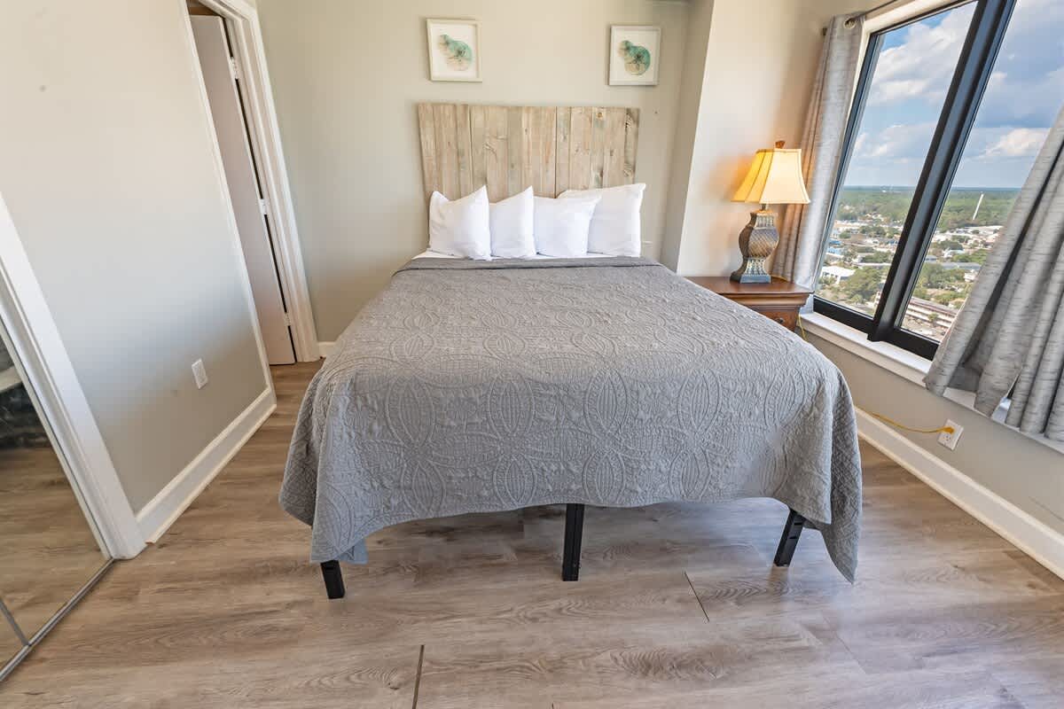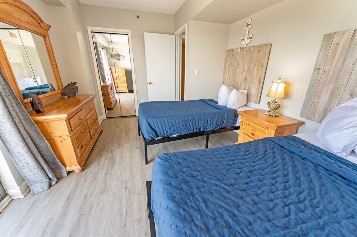 This two-bedroom, two-bathroom condo on the 22nd floor of the Palace Resort has a private balcony and is uniquely located in the resort. It has a large living room area, a queen bed, a twin bed, and a full bed, and can sleep up to five guests. The condo has beautiful flooring and decor, granite countertops, and a fully equipped kitchen with a table. It also has high-speed Wi-Fi, a high standard of cleaning, and free onsite parking. The sofa is not a sleeper sofa.