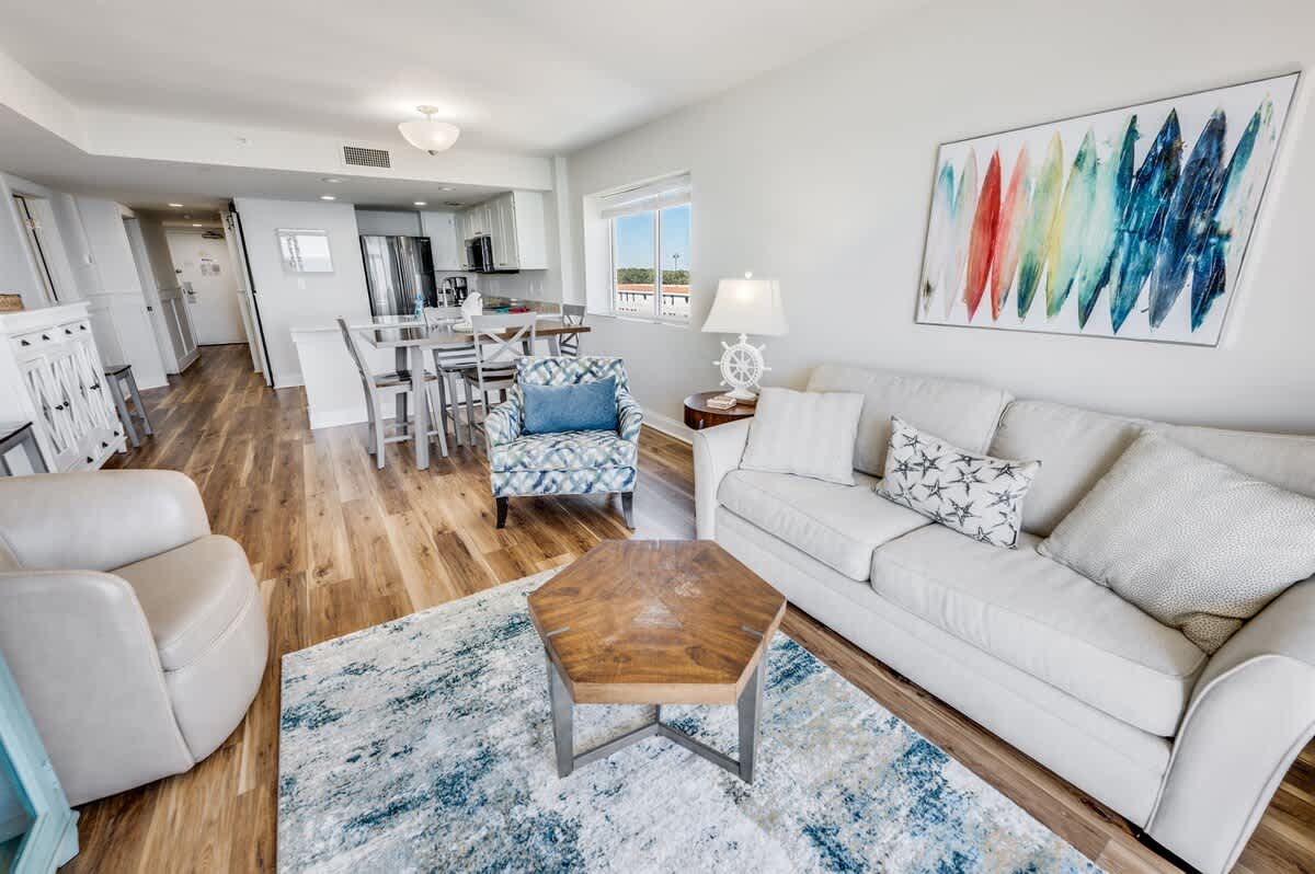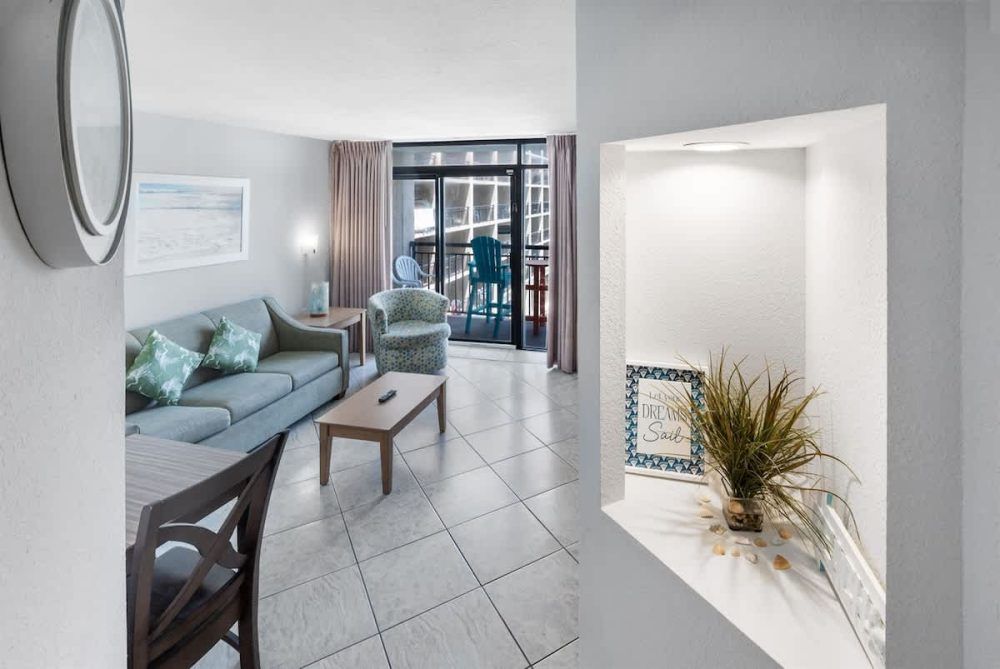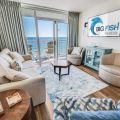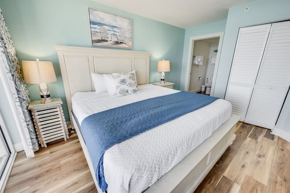 Our beachfront condo features 2 King Bed Beds, 1 Queen, and 1 Sleeper Sofa, 2 private bathrooms, and full-sized appliances. This beachfront condo sleeps up to 8. Enjoy the morning sunrise on your private oceanfront balcony overlooking the beautiful ocean. Amenities include, but are not limited to: a great outdoor pool deck with a stunning lawn with lounge chairs and umbrella tables. Camelot’s indoor pavilion with a glass front and potted plants contains a lazy river, a free-form pool, a small toddler pool, and a spa tub.