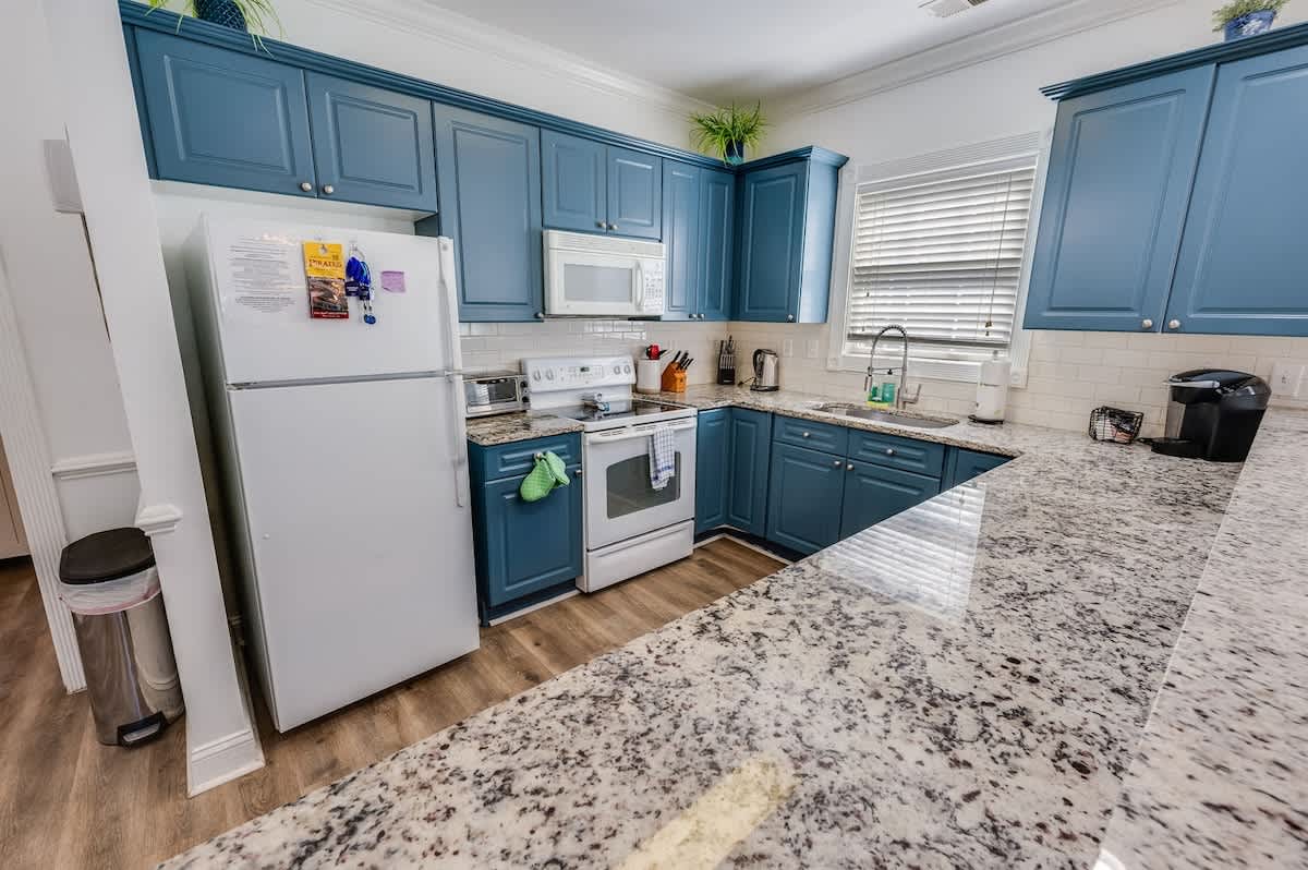 * Full-size fridge, microwave, and 2-burner cooktop
