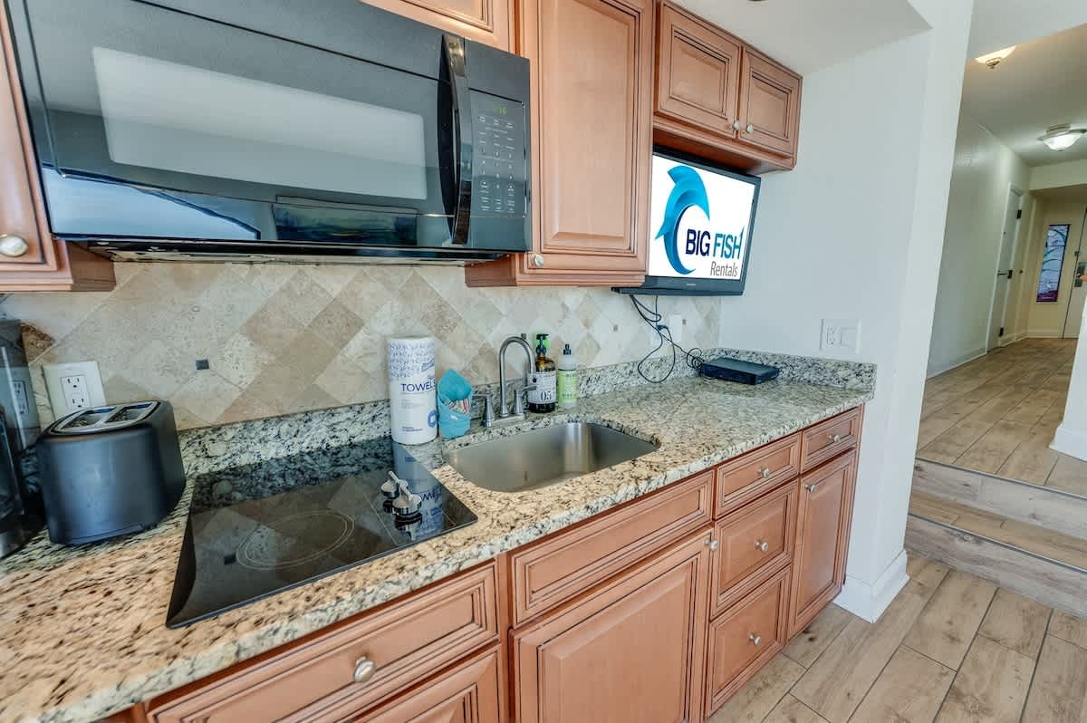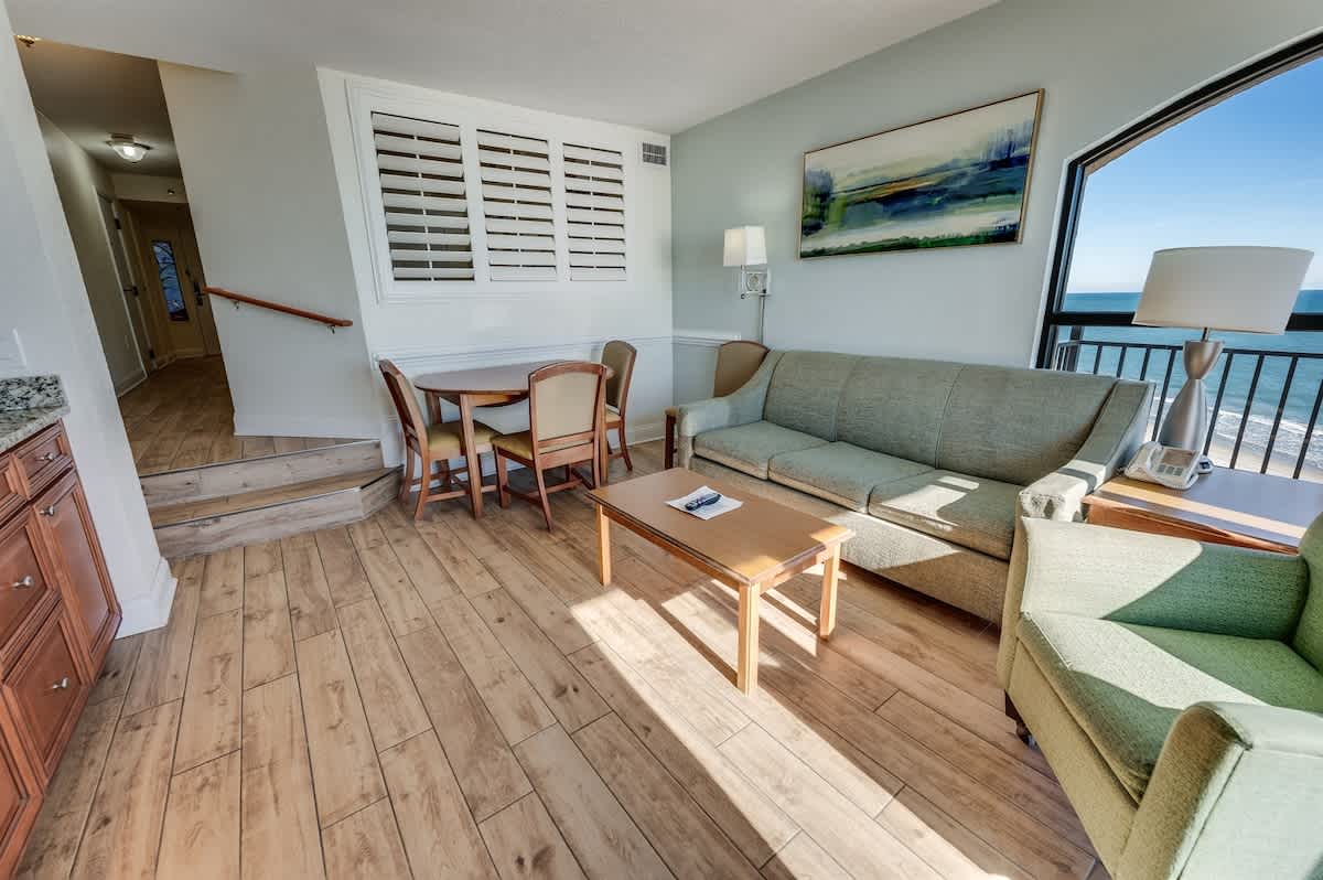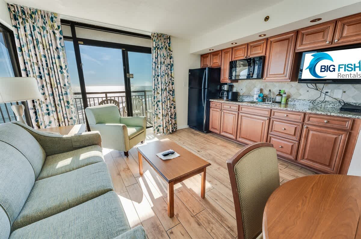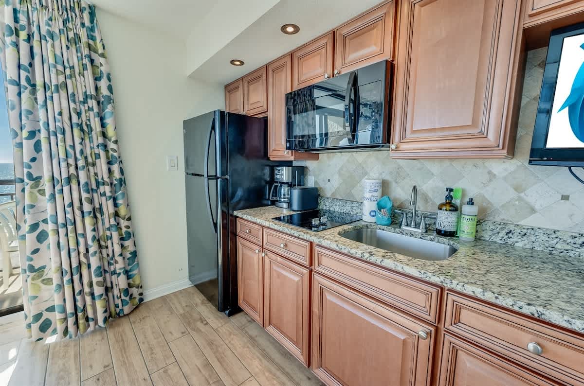Once you enter through a foyer, Private bathroom and bedroom to the left. Proceeding down the hallway opens up to the oceanfront main room, containing the sofa, kitchen table and cooking area which all overlook the direct view of the ocean. Amazing ocean views from the balcony and living area (and bedroom) are the perfect setting for your morning coffee or evening cocktails. Enjoy the convenience of your own kitchen in this condo featuring a full-sized fridge, stove, and microwave.