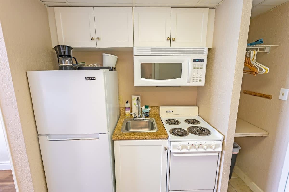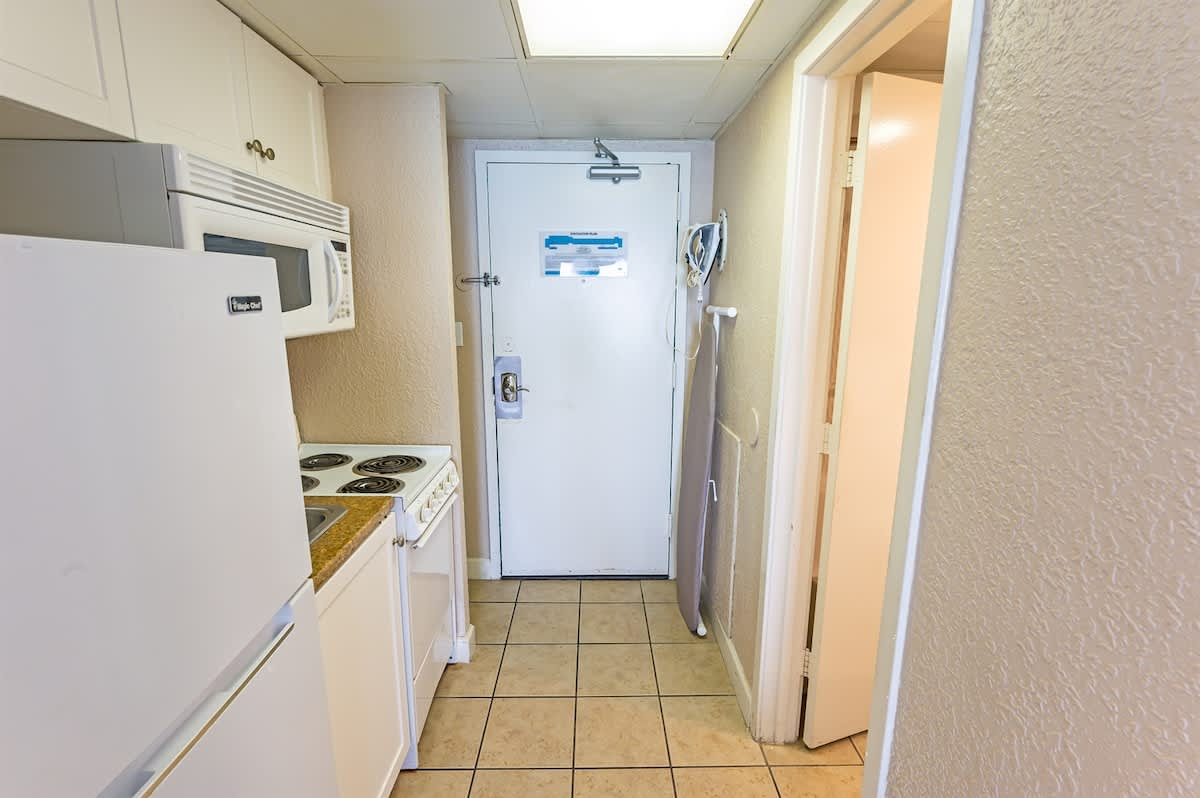 Complete kitchen equipped with an oven for cooking, featuring 2 Queen Beds! We look forward to your visit to our home! Stunning views and relaxing days on the soft, white sand await you at this vacation rental condo in Myrtle Beach!