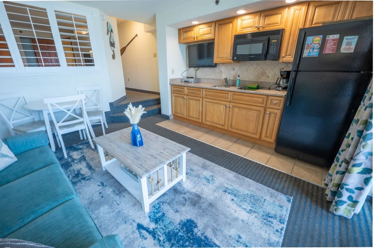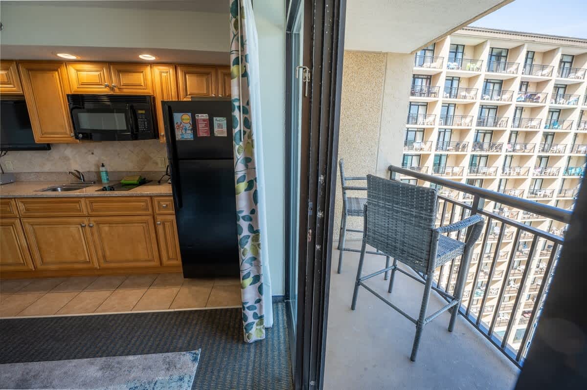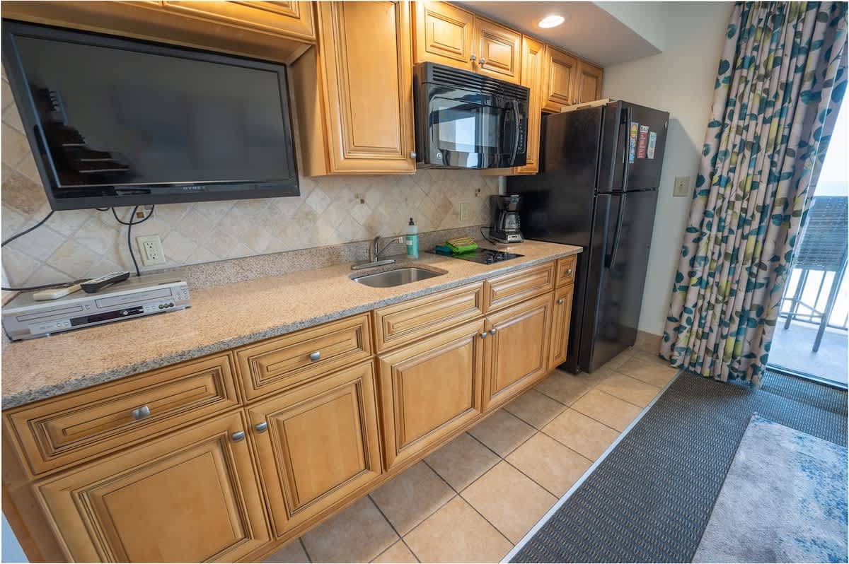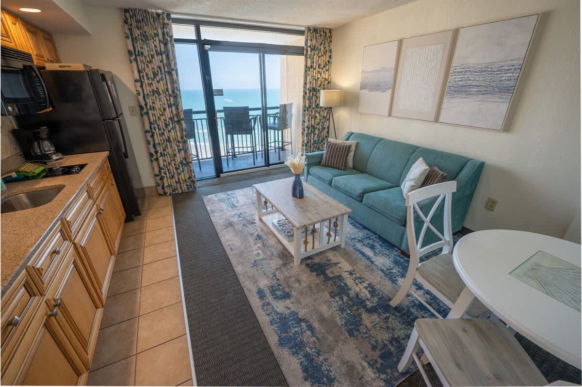 Once you enter through a foyer, Private bathroom and bedroom to the left. Proceeding down the hallway opens up to the oceanfront main room, containing the sofa, kitchen table and cooking area which all overlook the direct view of the ocean. Amazing ocean views from the balcony and living area (and bedroom) are the perfect setting for your morning coffee or evening cocktails. Enjoy the convenience of your own kitchen in this condo featuring a full-sized fridge, stove, and microwave.