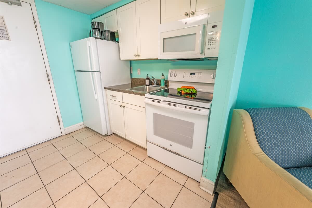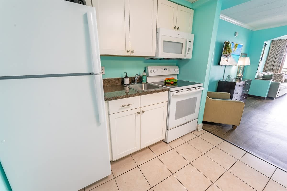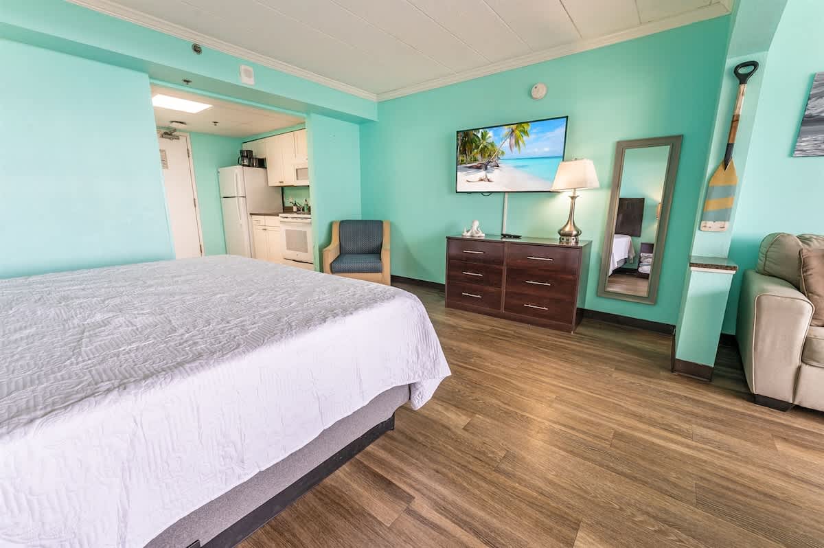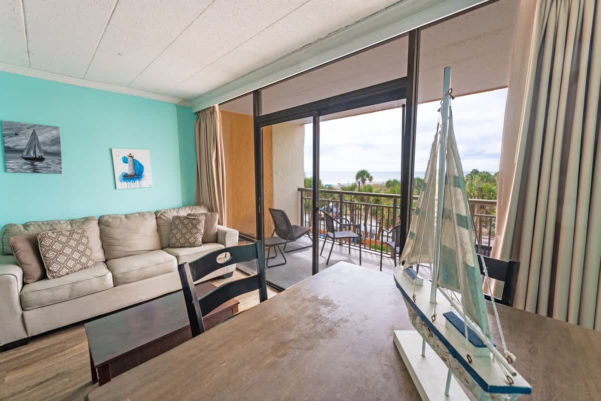 This beach-front condo at Caravelle Resort has a direct ocean view from the 3rd floor. Remodeled in 2024, it features new flooring, decor, HDTV, full fridge, microwave, and stove/oven. Sleeping four with a king bed and sleeper sofa, it includes sheets and towels, and is professionally cleaned. The resort offers an onsite restaurant and poolside bar. The 7th-floor pool deck is under construction.