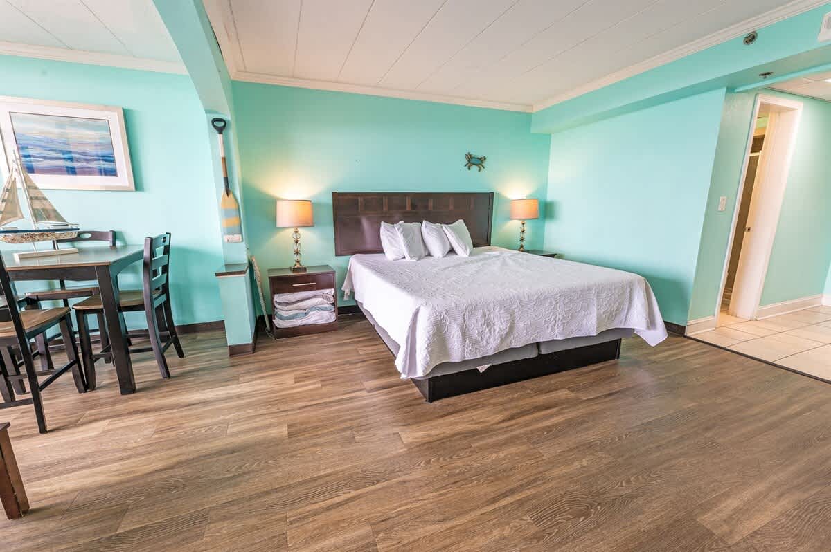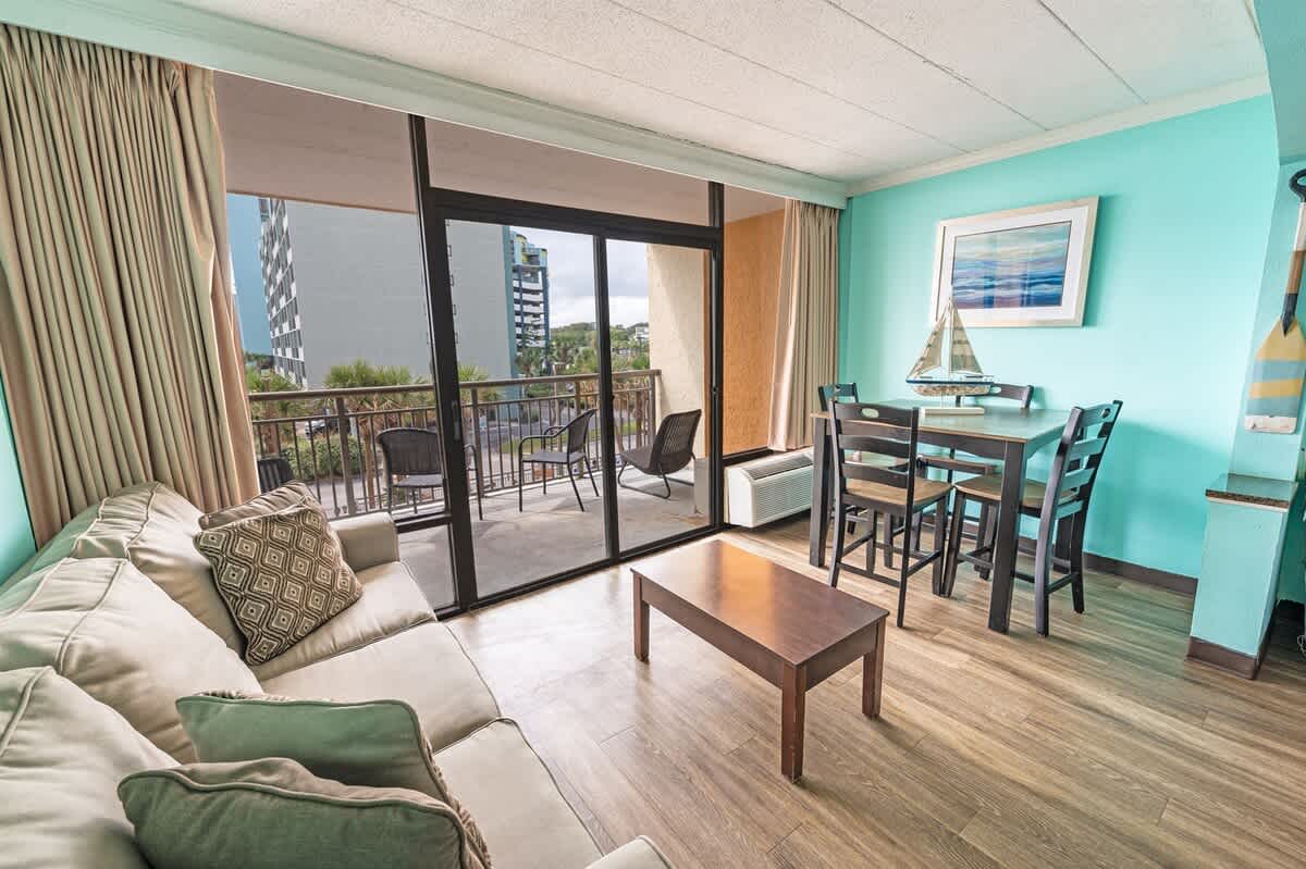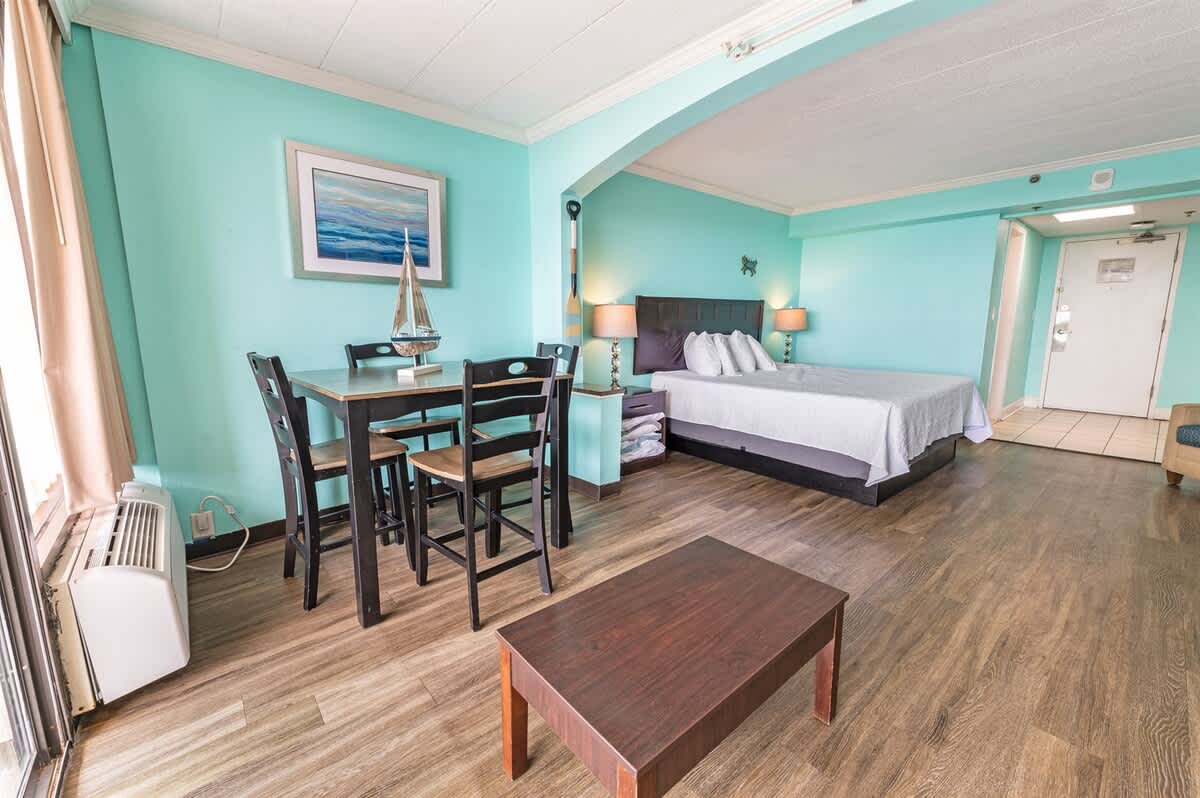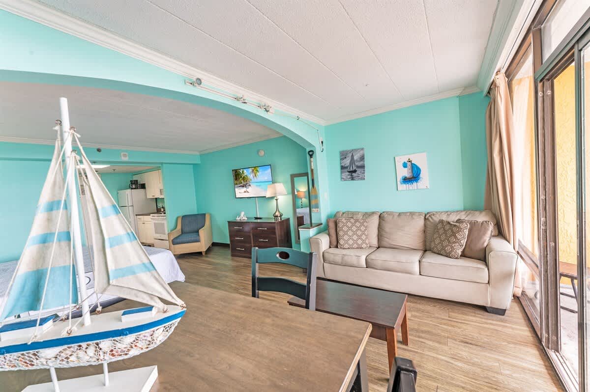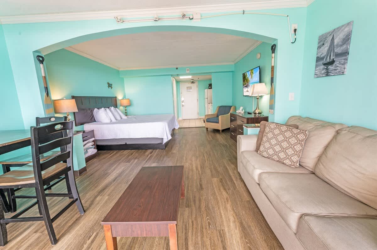 This beach-front condo at Caravelle Resort has a direct ocean view from the 3rd floor. Remodeled in 2024, it features new flooring, decor, HDTV, full fridge, microwave, and stove/oven. Sleeping four with a king bed and sleeper sofa, it includes sheets and towels, and is professionally cleaned. The resort offers an onsite restaurant and poolside bar. The 7th-floor pool deck is under construction.