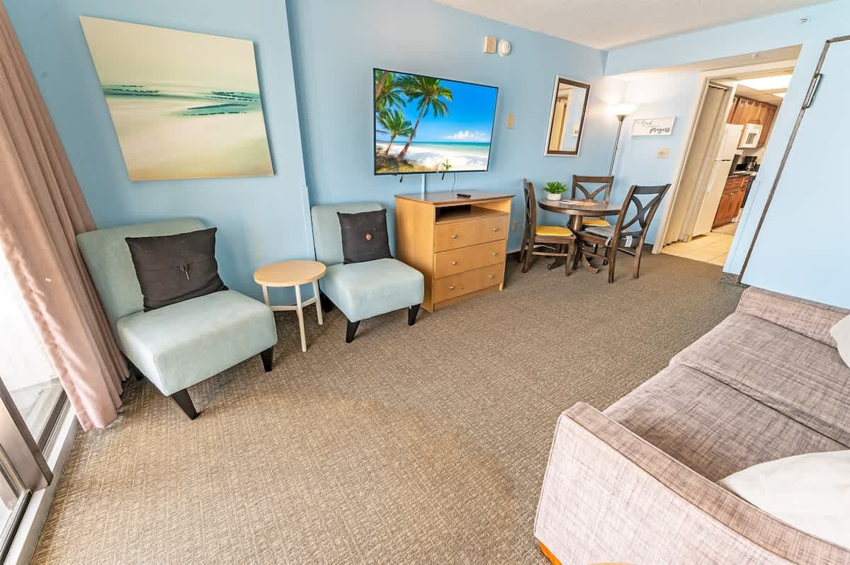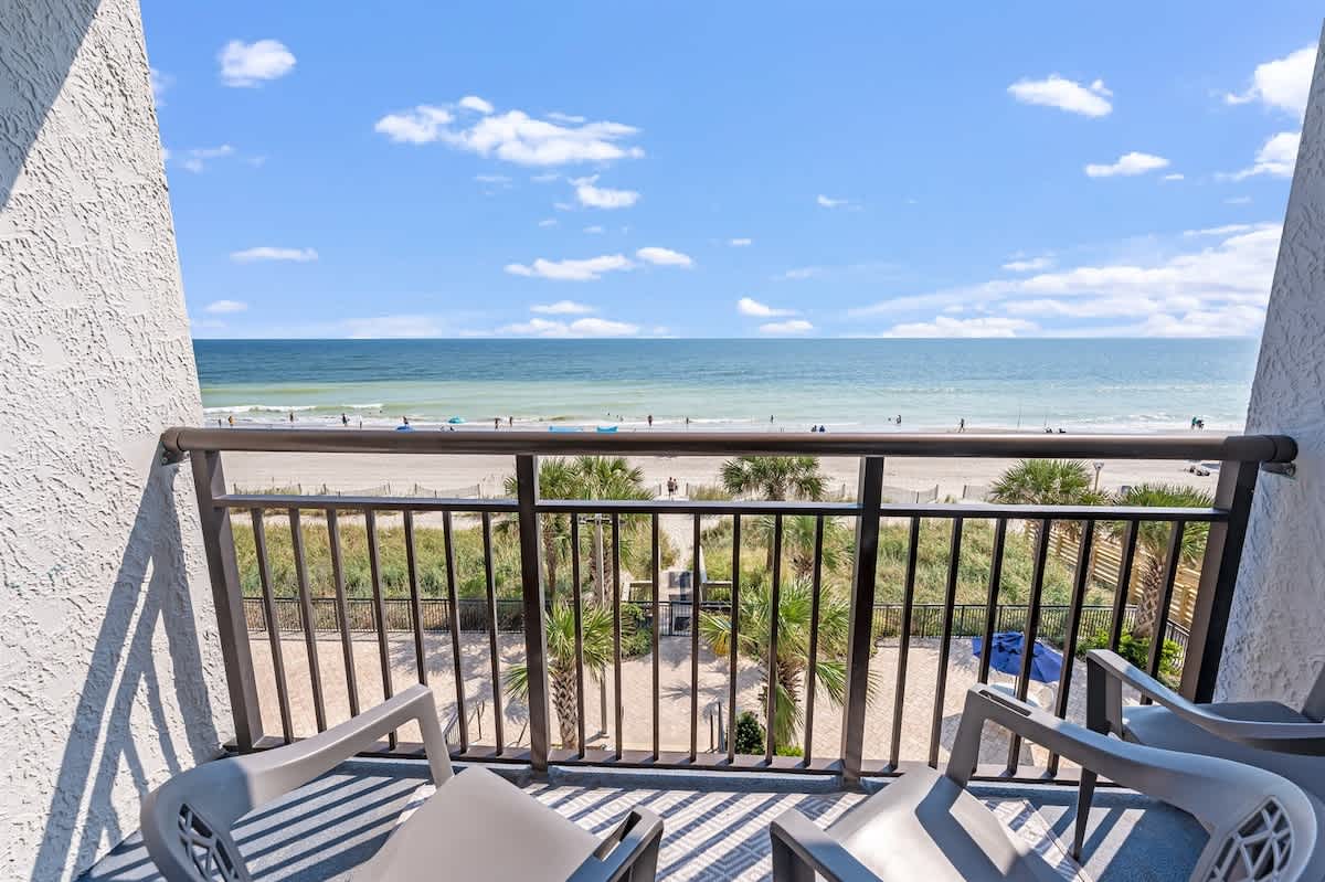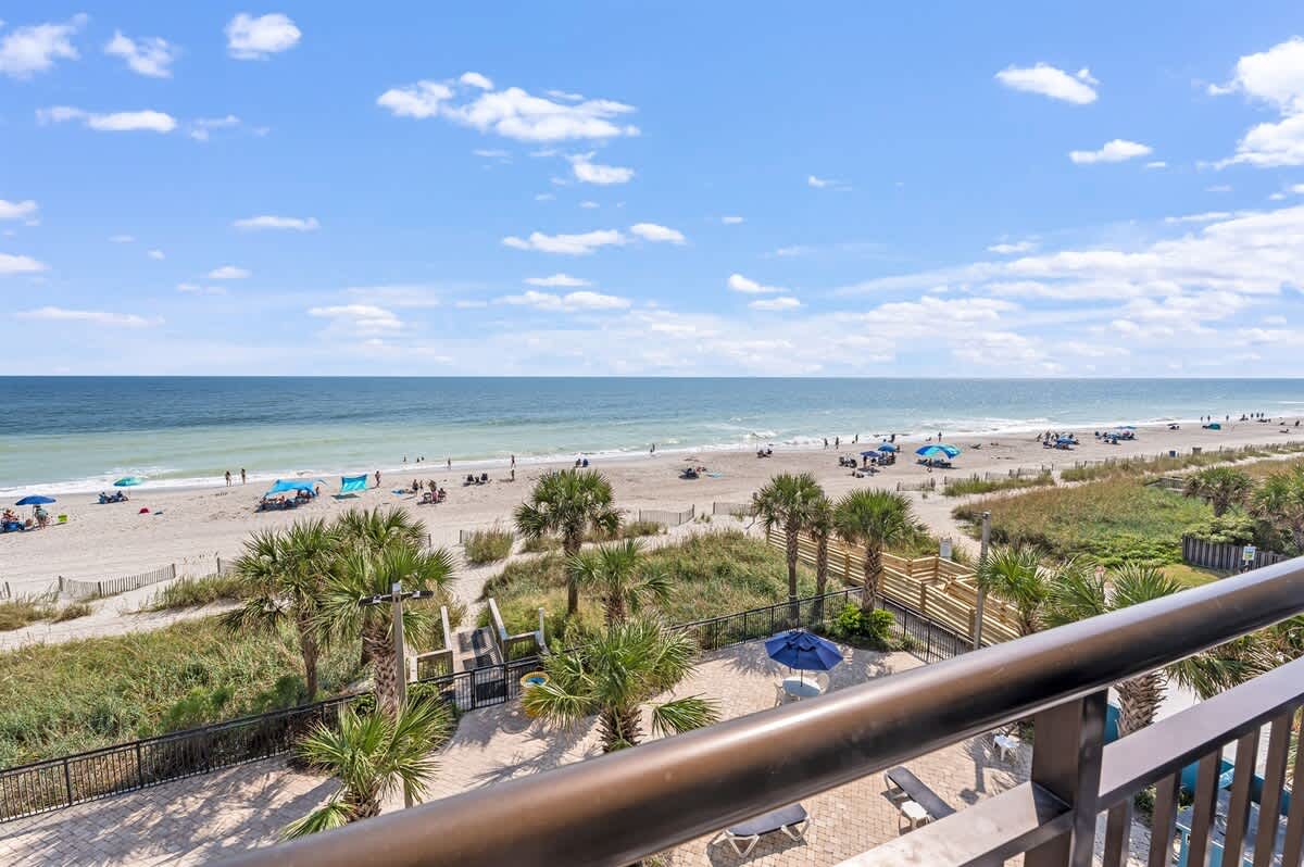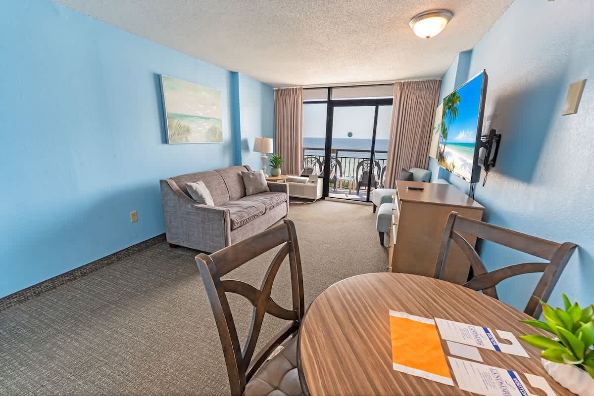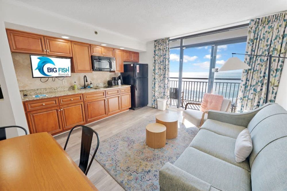 This newly renovated fourth-floor unit at Landmark Resort is now available at Big Fish Rentals. It has a private balcony with a direct oceanfront view. The condo has two beds and a Murphy bed to accommodate up to six guests. It comes with sheets and towels. The unit has been professionally cleaned and has new LCD TVs and appliances. On-site parking is free. Amenities include a heated oceanfront pool, oceanfront whirlpool, lazy river, indoor pools, indoor lazy river, and kiddie pools.