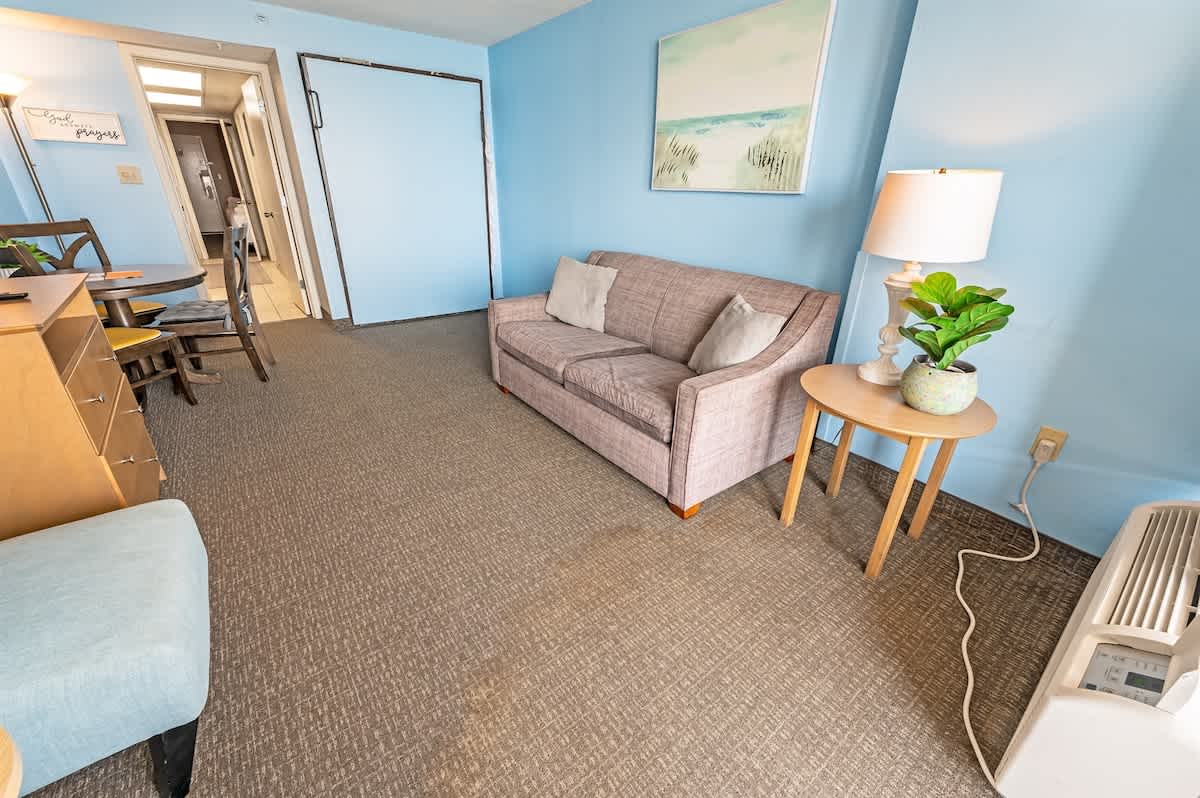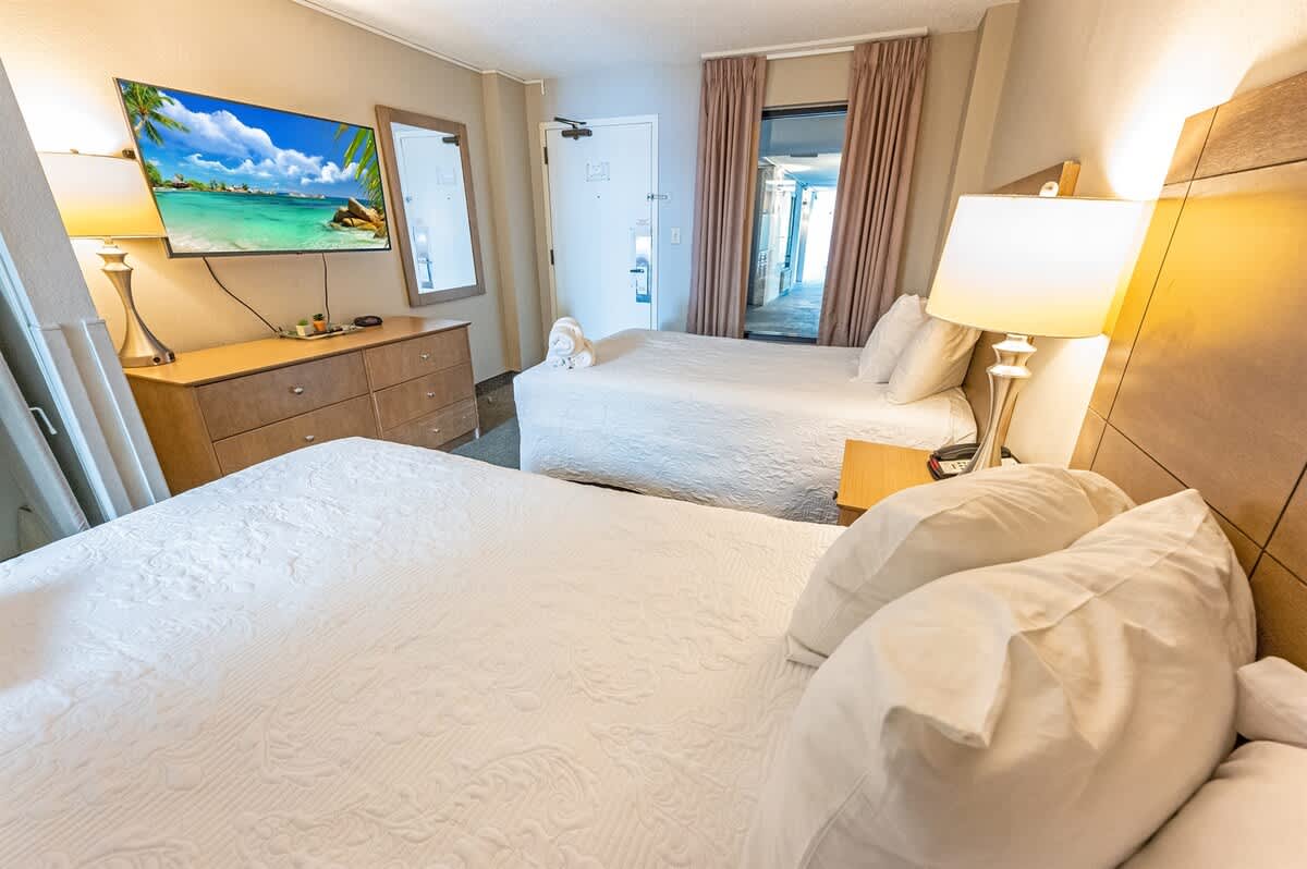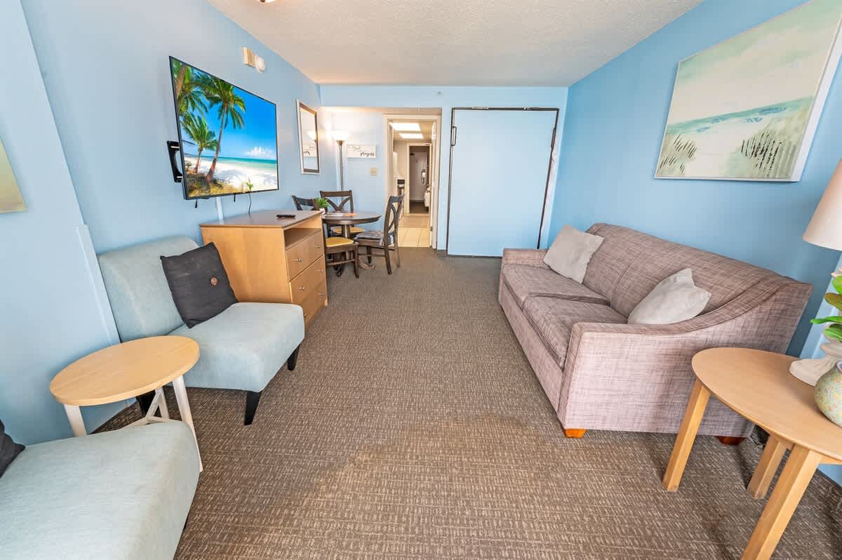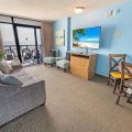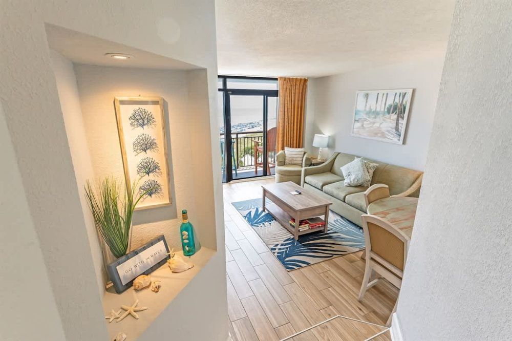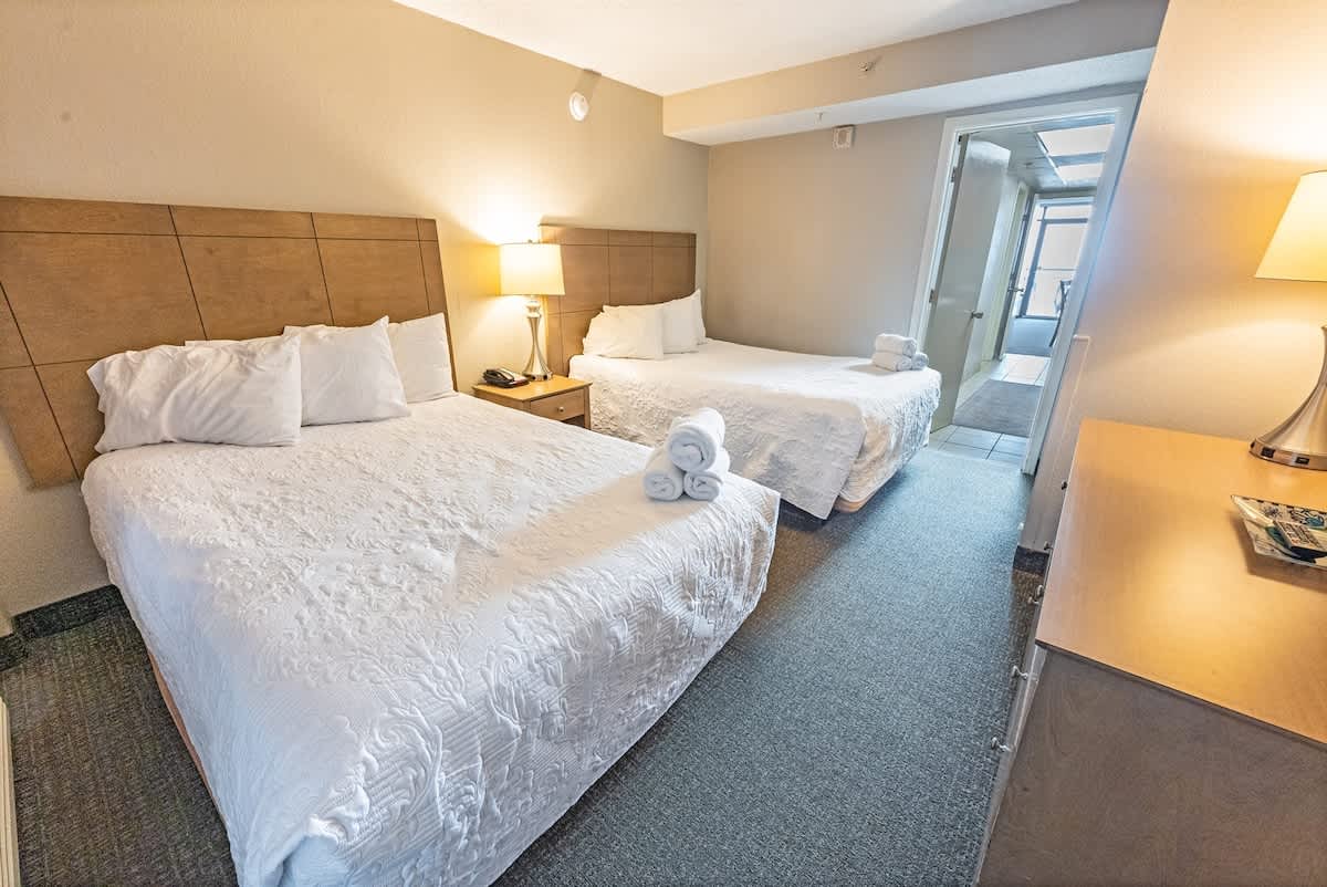 This newly renovated fourth-floor unit at Landmark Resort is now available at Big Fish Rentals. It has a private balcony with a direct oceanfront view. The condo has two beds and a Murphy bed to accommodate up to six guests. It comes with sheets and towels. The unit has been professionally cleaned and has new LCD TVs and appliances. On-site parking is free. Amenities include a heated oceanfront pool, oceanfront whirlpool, lazy river, indoor pools, indoor lazy river, and kiddie pools.