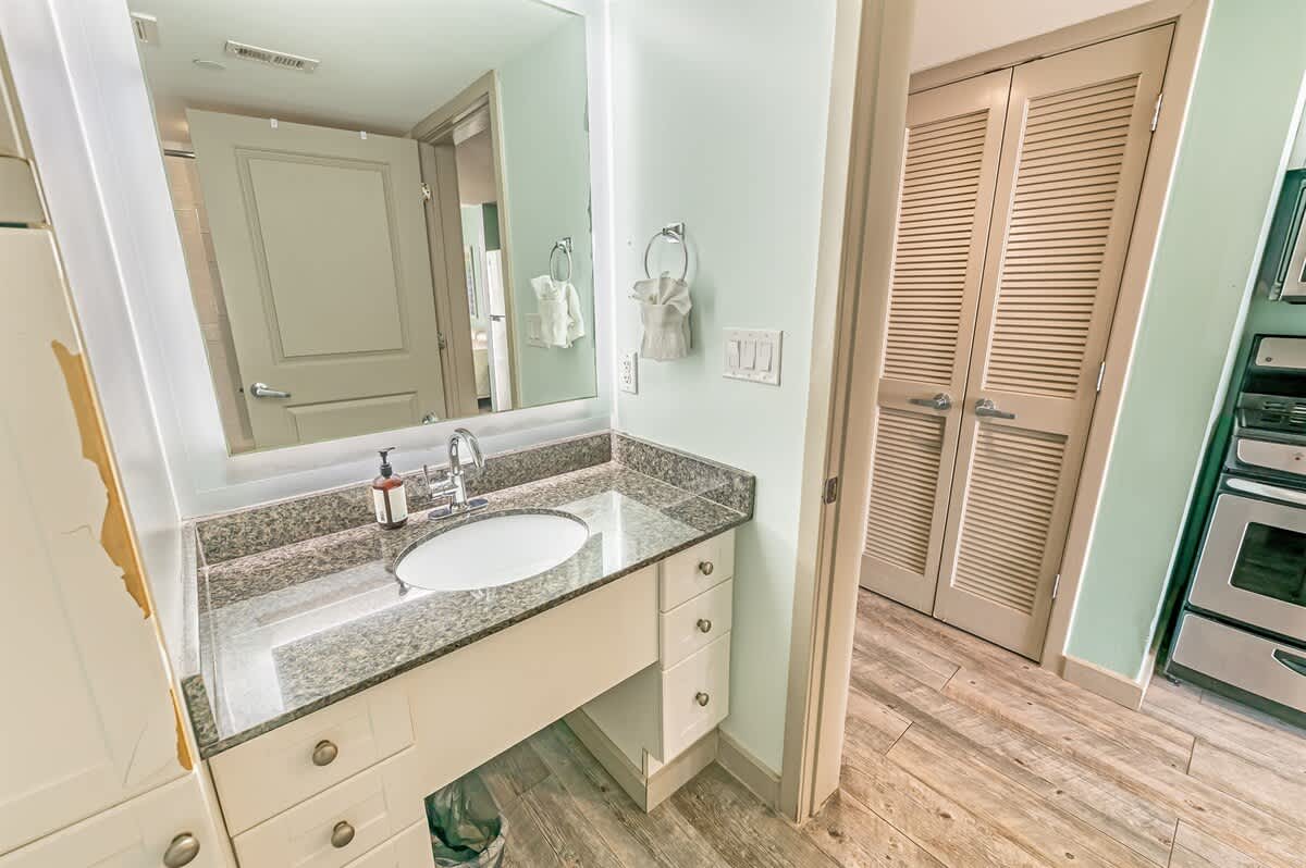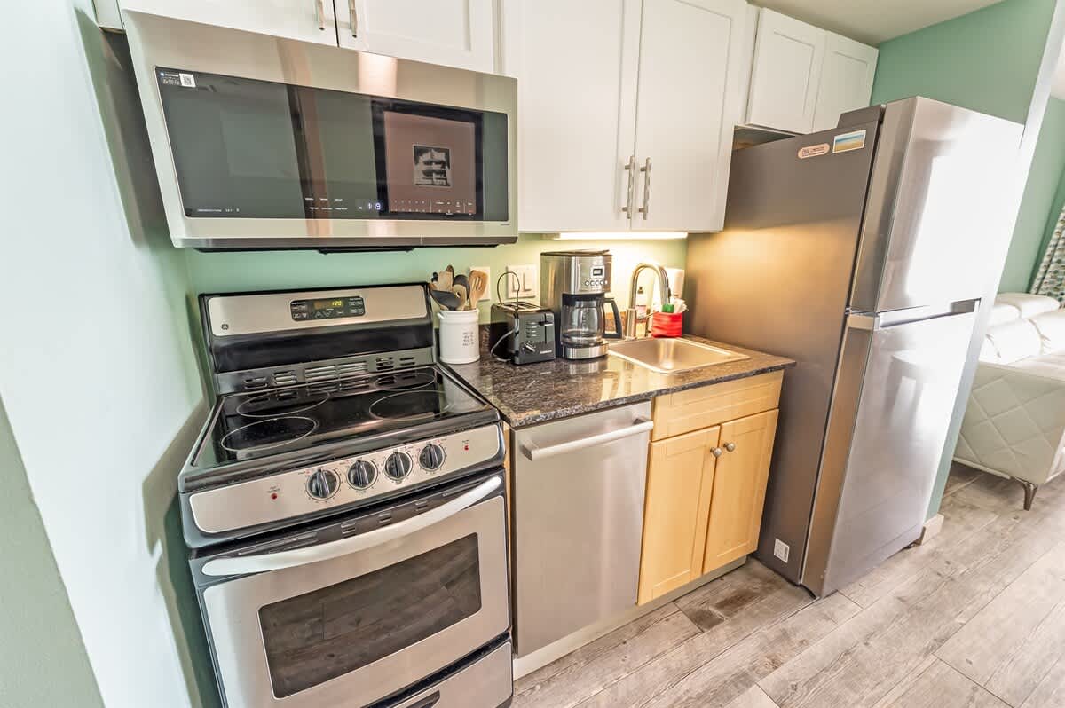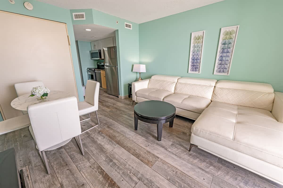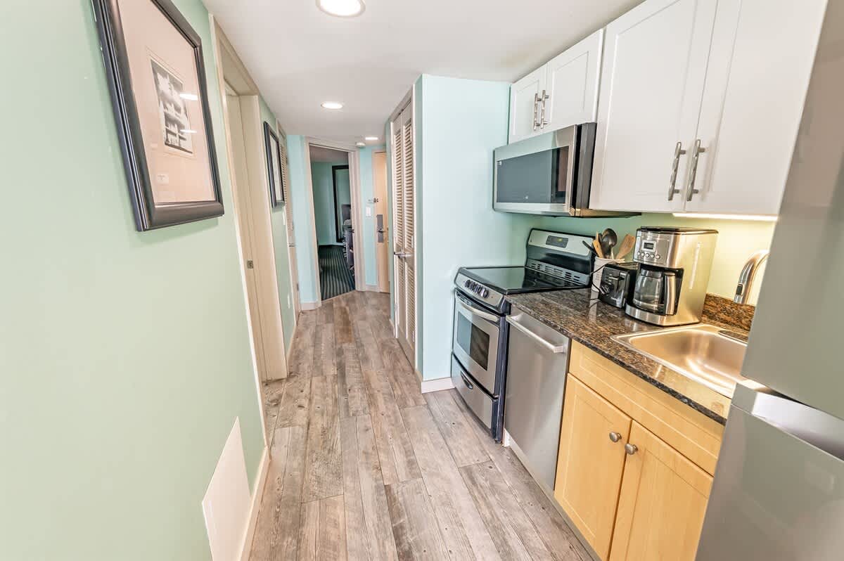 New full-sized Samsung refrigerator, Bosch dishwasher, new microwave, and glass top 4 burner stove included in the beachfront condo. Two Queen Beds and one murphy bed is ready for your entire family! The bathroom features spa garden with a jet tub. Heated pools and private ocean balcony along with lazy river and hot tubs!Hardwood tiled floors throughout living area, kitchen, and bathroom!