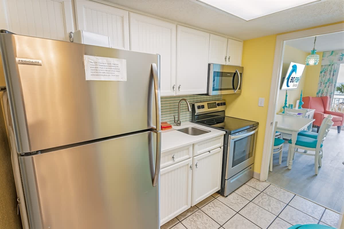 The condo includes a fully equipped kitchen featuring major appliances such as a refrigerator, freezer, microwave, coffee maker, and toaster. All necessary cooking equipment and dining essentials are provided, making it easy to prepare meals during your stay.