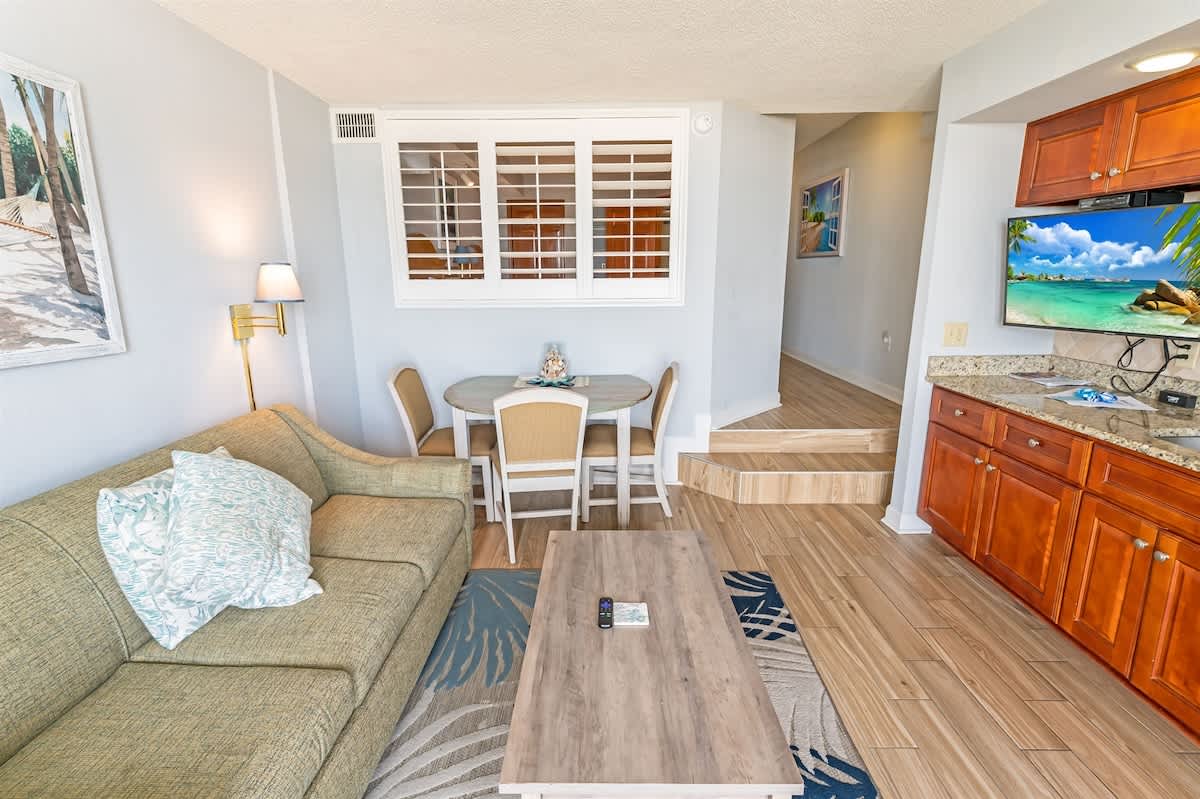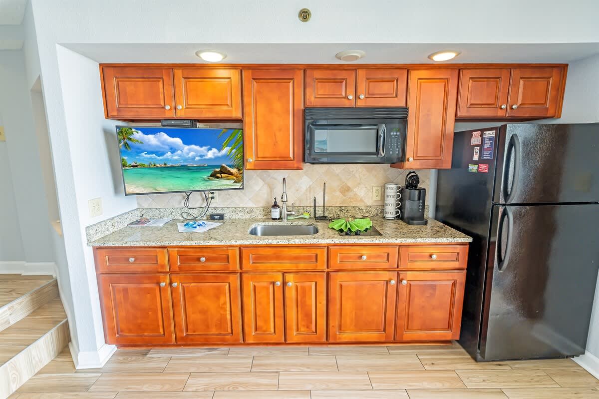 Once you enter through a foyer, Private bathroom and bedroom to the left. Proceeding down the hallway opens up to the oceanfront main room, containing the sofa, kitchen table and cooking area which all overlook the direct view of the ocean. Amazing ocean views from the balcony and living area (and bedroom) are the perfect setting for your morning coffee or evening cocktails. Enjoy the convenience of your own kitchen in this condo featuring a full-sized fridge, stove, and microwave.