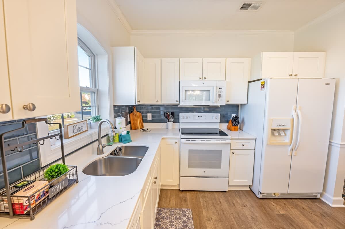 * Full-size fridge, microwave, and 2-burner cooktop