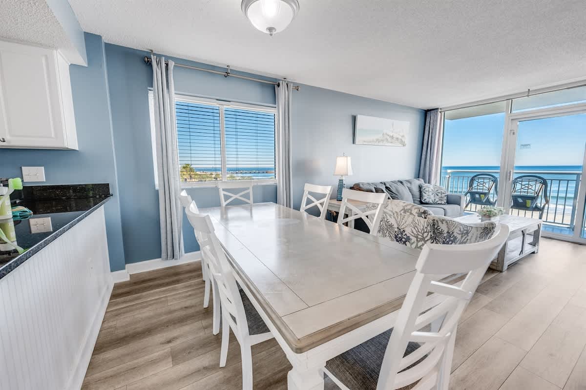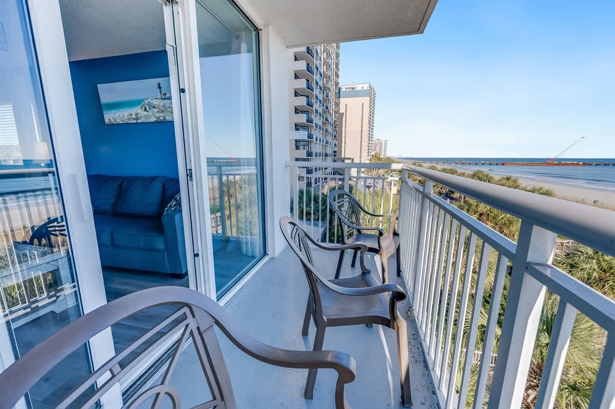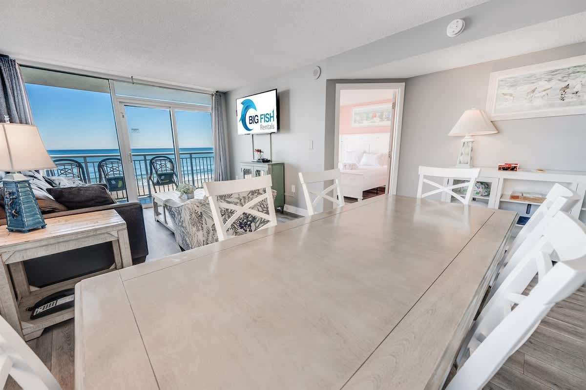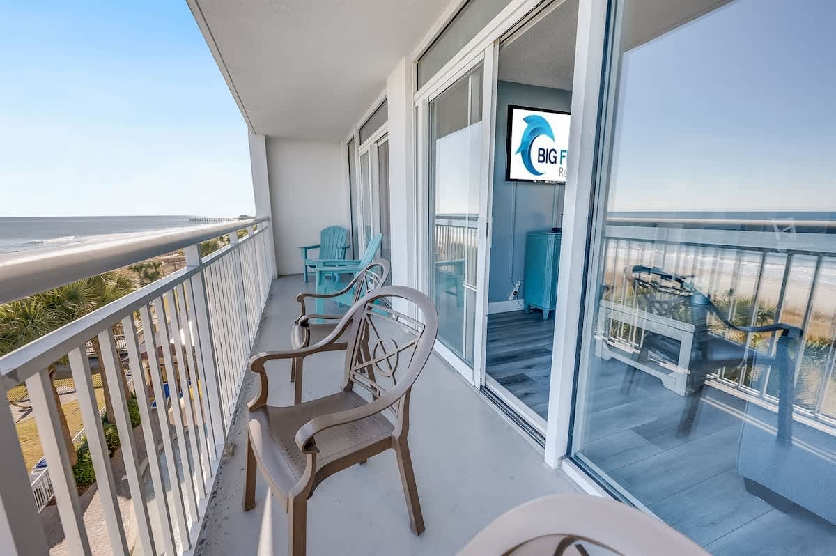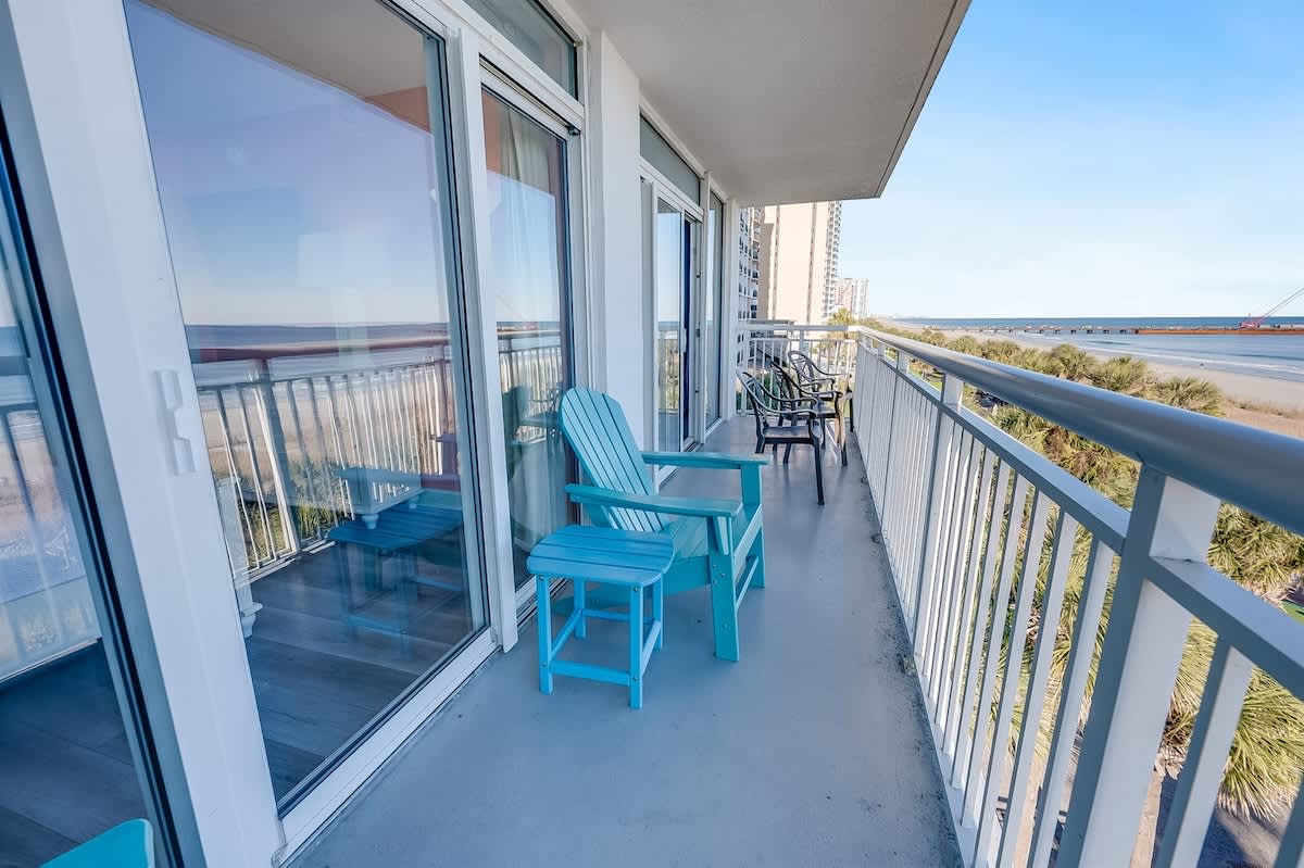 Our beachfront condo features 1 King Bed, 1 Queen,1 Full, 1 Twin, and 1 Sleeper Sofa, 2 private bathrooms, and has full-sized appliances. This beachfront condo sleeps up to 8. Enjoy the morning sunrise on your private oceanfront balcony overlooking the beautiful ocean. Amenities include, but are not limited to: a great outdoor pool deck with a stunning lawn with lounge chairs and umbrella tables. Camelot’s indoor pavilion with a glass front and potted plants contain a lazy river, a free-form pool, a small toddler pool, and a spa tub.