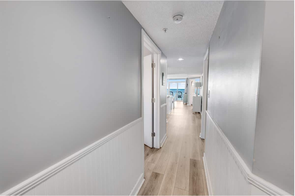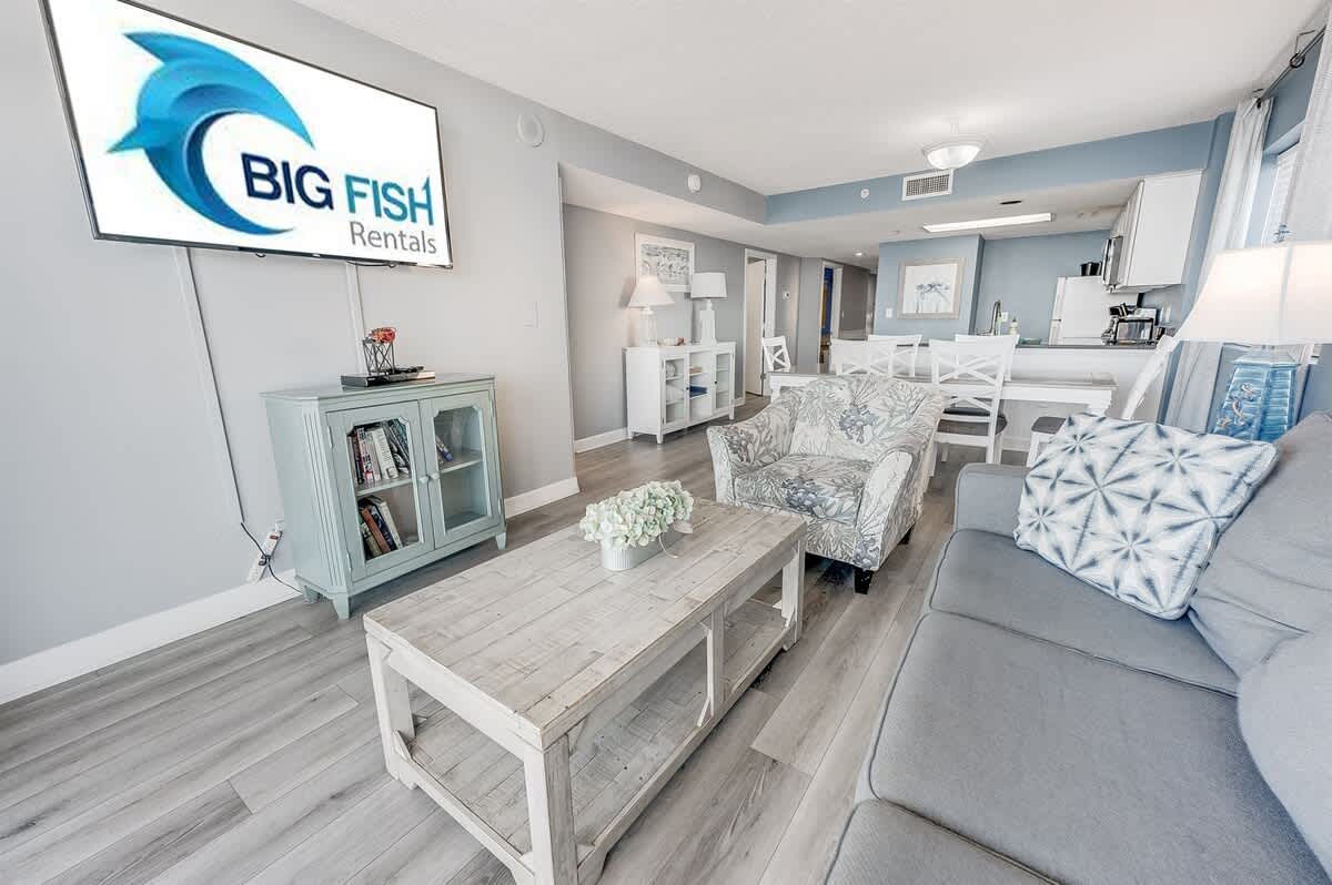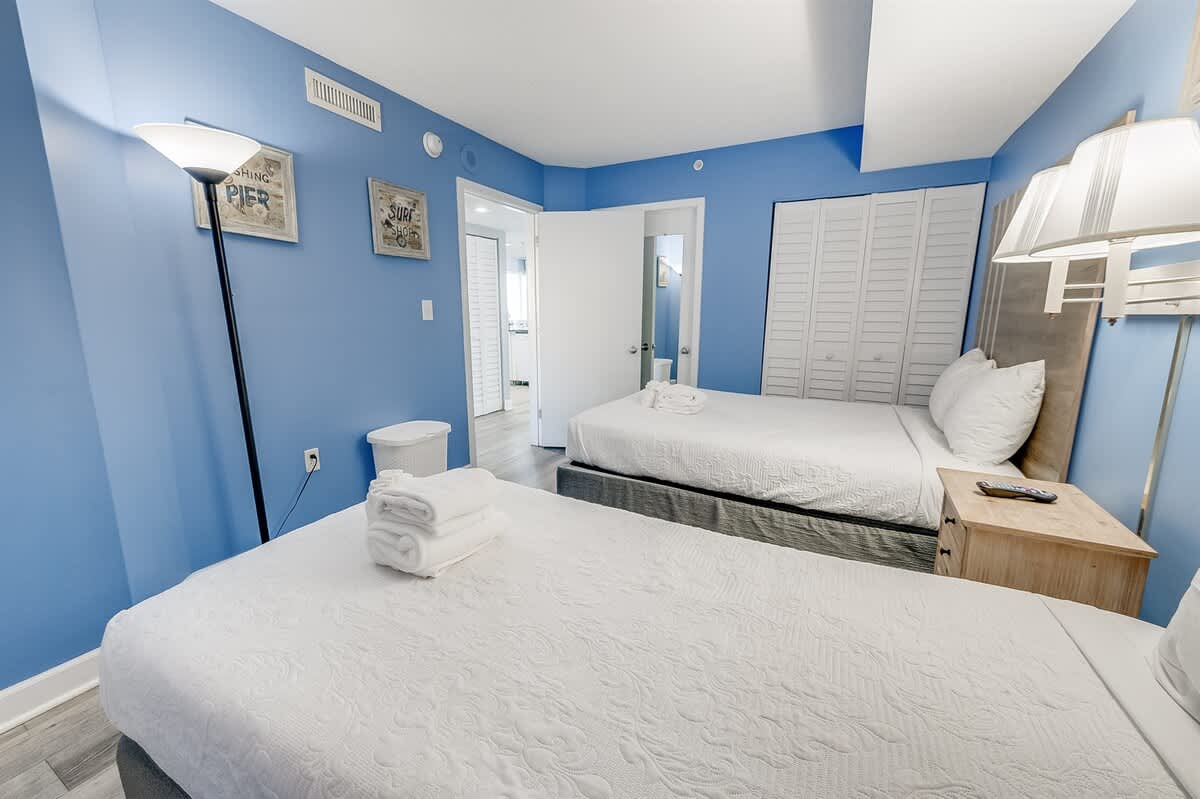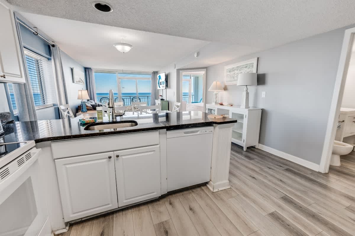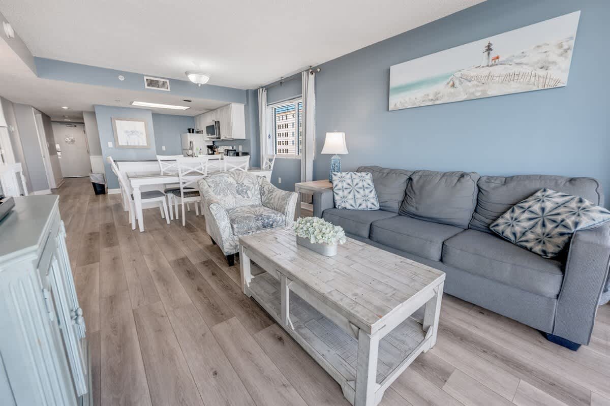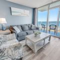 Our beachfront condo features 1 King Bed, 1 Queen,1 Full, 1 Twin, and 1 Sleeper Sofa, 2 private bathrooms, and has full-sized appliances. This beachfront condo sleeps up to 8. Enjoy the morning sunrise on your private oceanfront balcony overlooking the beautiful ocean. Amenities include, but are not limited to: a great outdoor pool deck with a stunning lawn with lounge chairs and umbrella tables. Camelot’s indoor pavilion with a glass front and potted plants contain a lazy river, a free-form pool, a small toddler pool, and a spa tub.