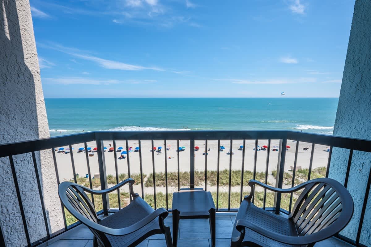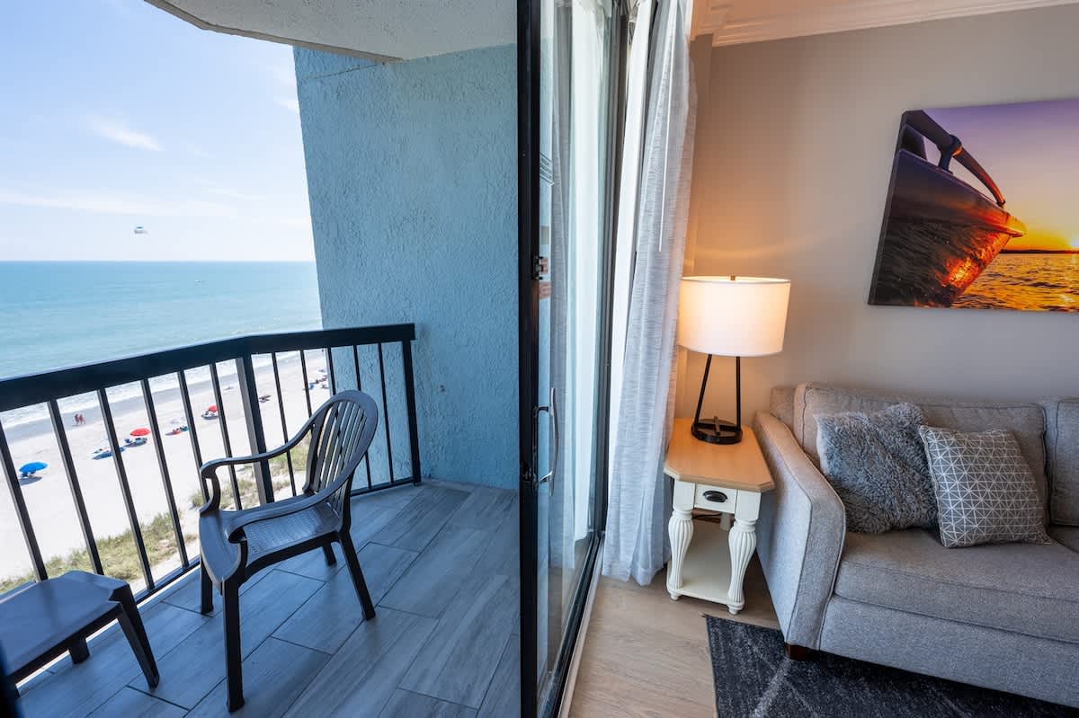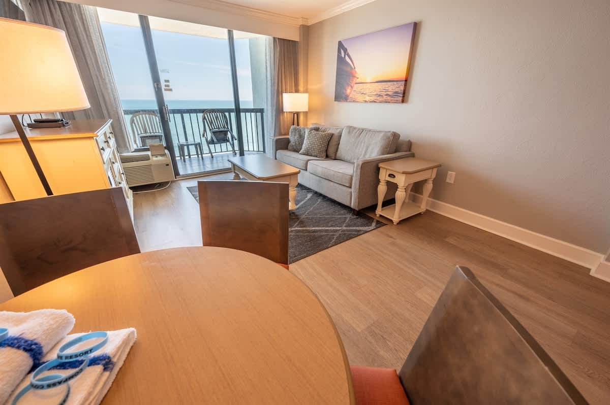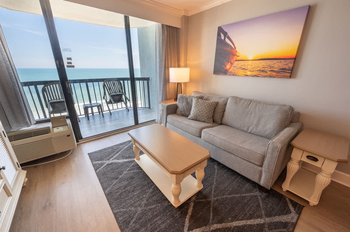 Our beachfront condo features 1 King, 1 Sleeper Sofa, a private bathroom, full-sized appliances. This beachfront condo sleeps up to 4. Enjoy the morning sunrise on your private oceanfront balcony overlooking the beautiful ocean. Amenities include, but are not limited to: a large kiddie fun activity pool area, 3 lazy rivers, 7 hot tubs, 2 outdoor pools, 1 indoor pool, and more! Great available unit in a fantastic resort!