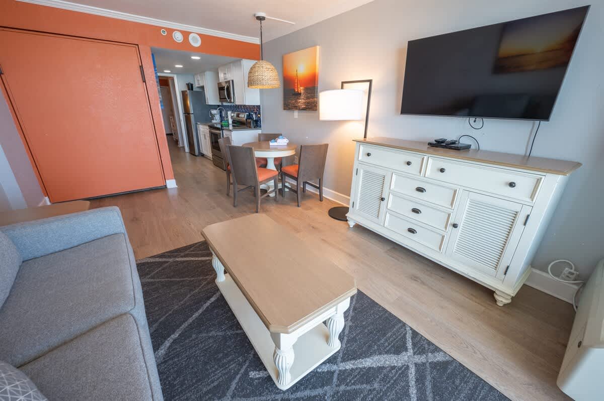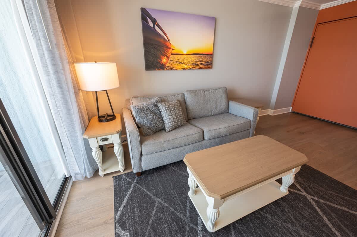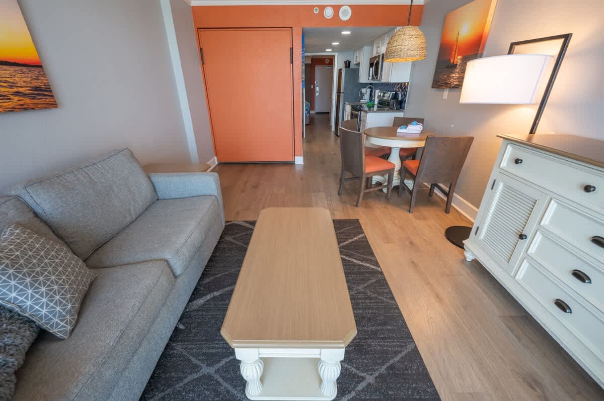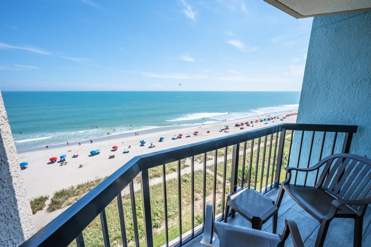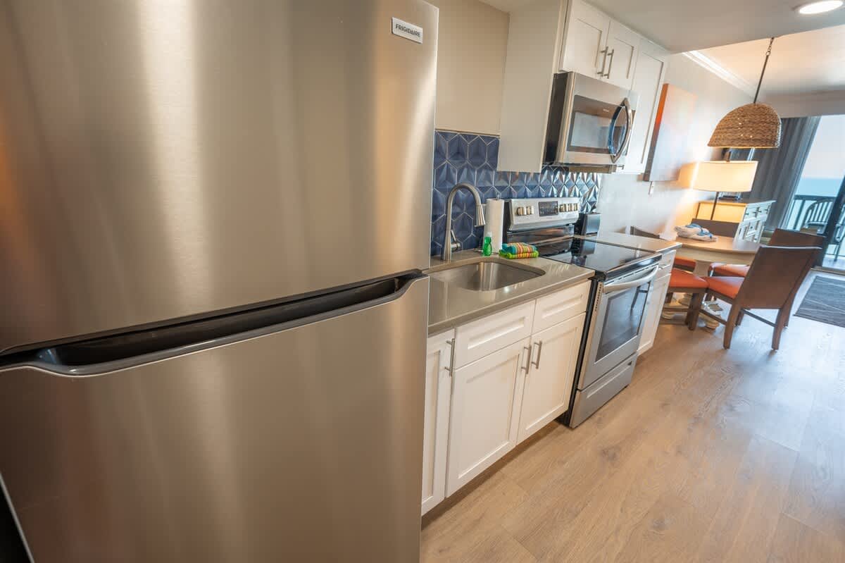 Our beachfront condo features 1 King, 1 Sleeper Sofa, a private bathroom, full-sized appliances. This beachfront condo sleeps up to 4. Enjoy the morning sunrise on your private oceanfront balcony overlooking the beautiful ocean. Amenities include, but are not limited to: a large kiddie fun activity pool area, 3 lazy rivers, 7 hot tubs, 2 outdoor pools, 1 indoor pool, and more! Great available unit in a fantastic resort!