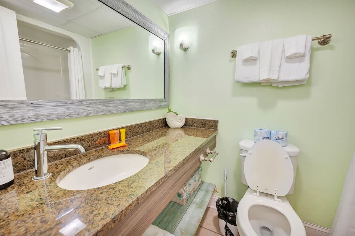 – Private bathroom with granite countertops.