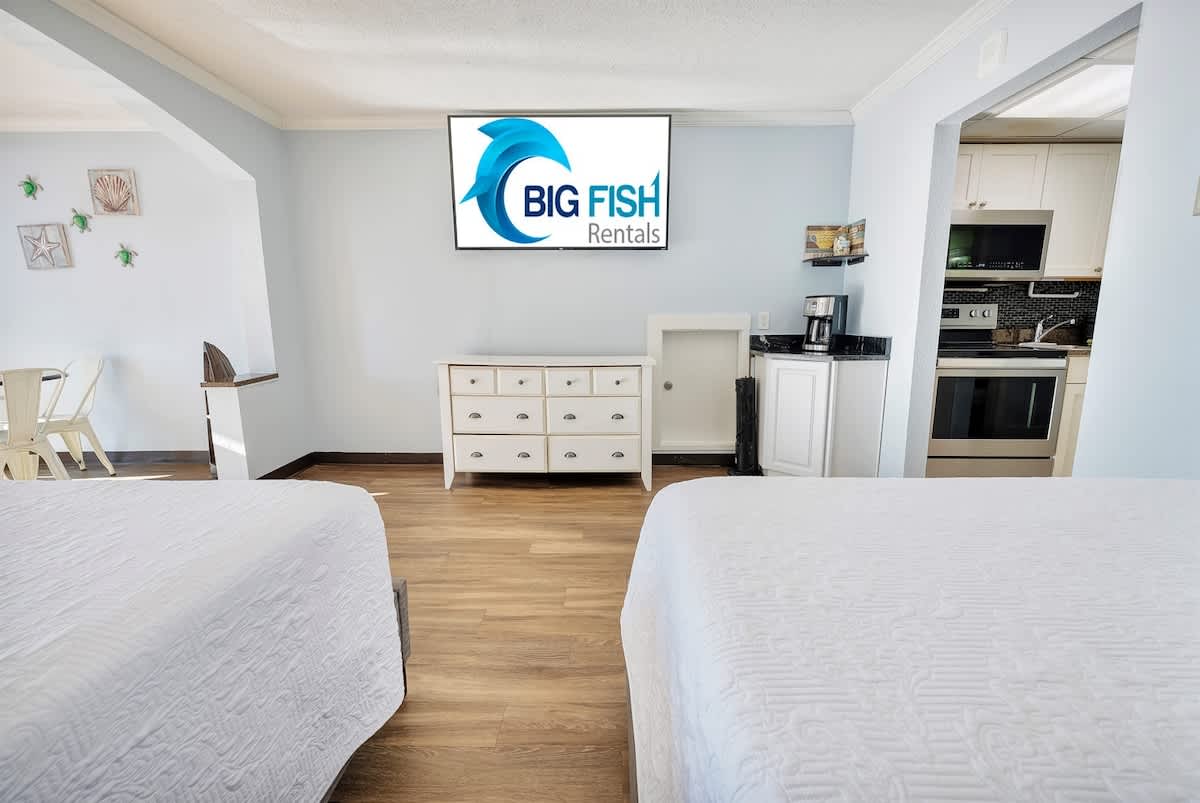 – 2 Queen Beds and 1 sleeper sofa, Sleeps up to 6. Sheets and towels are provided.