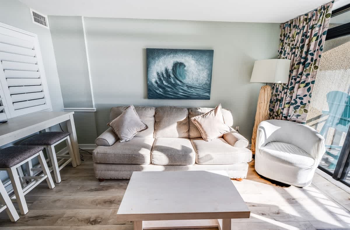 Once you enter through a foyer, Private bathroom, and bedroom to the left. Proceeding down the hallway opens up to the oceanfront main room, containing the sofa, kitchen table, and cooking area which all overlook the direct view of the ocean. Amazing ocean views from the balcony and living area (and bedroom) are the perfect setting for your morning coffee or evening cocktails. Enjoy the convenience of your own kitchen in this condo featuring a full-sized fridge, stove, and microwave.