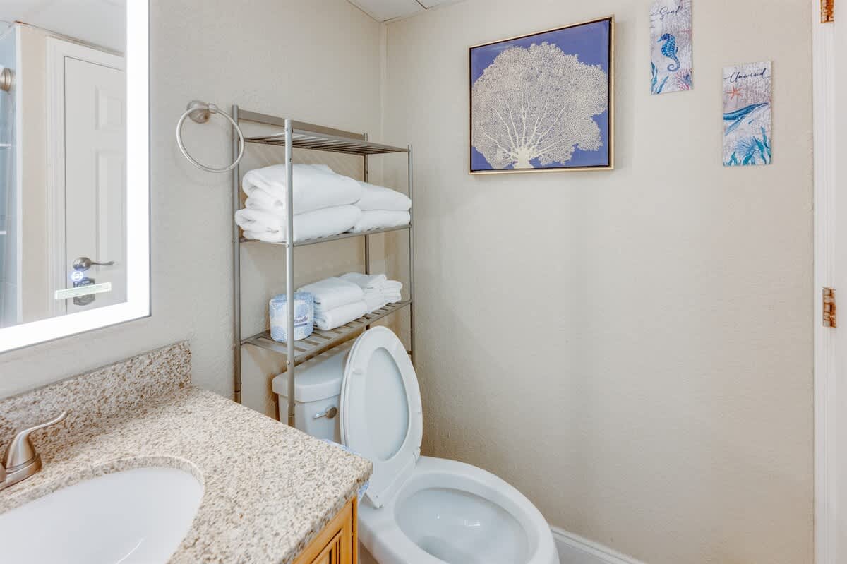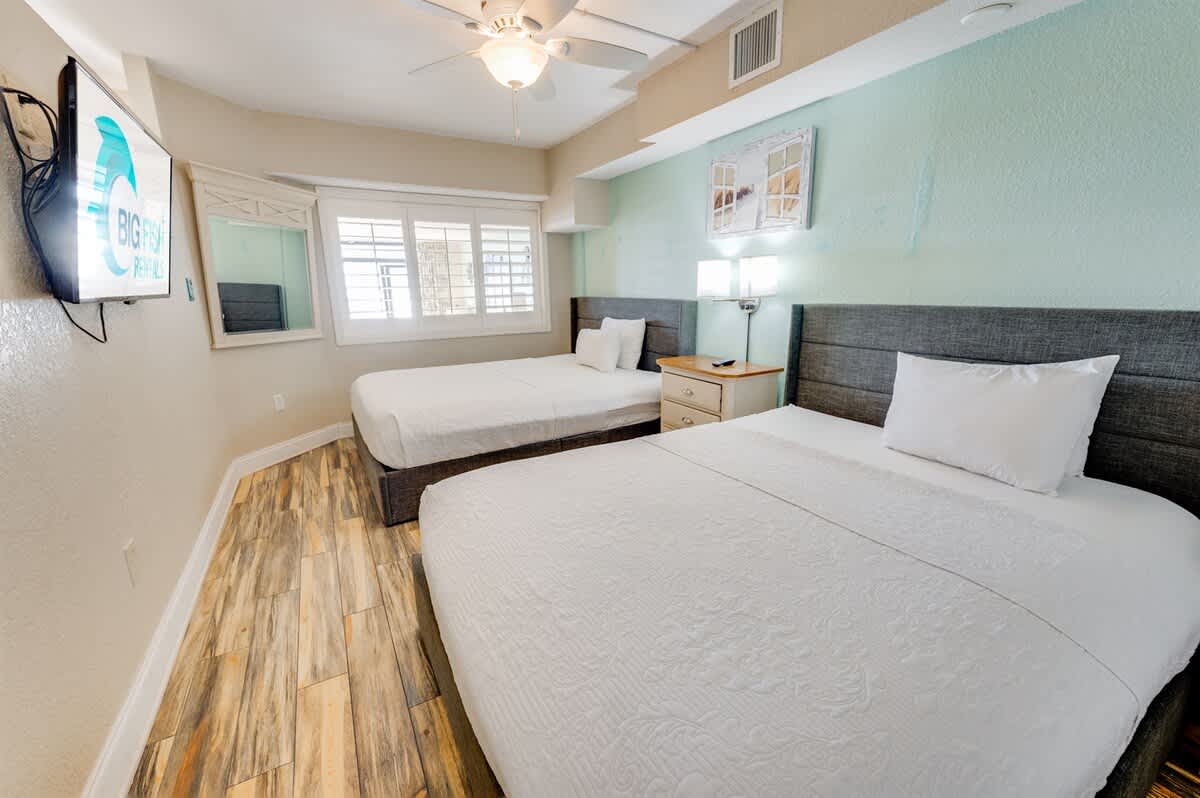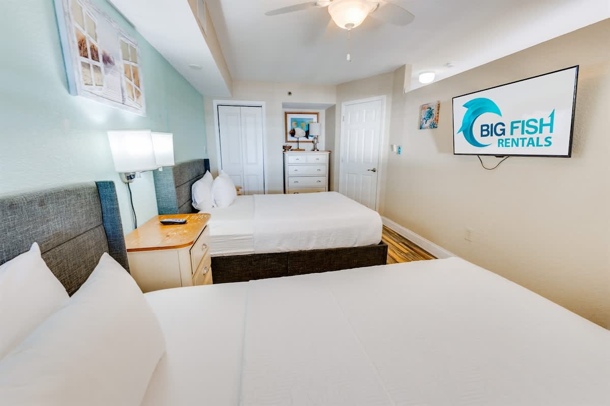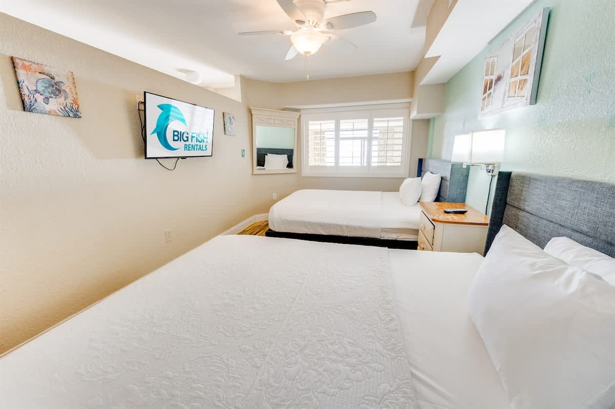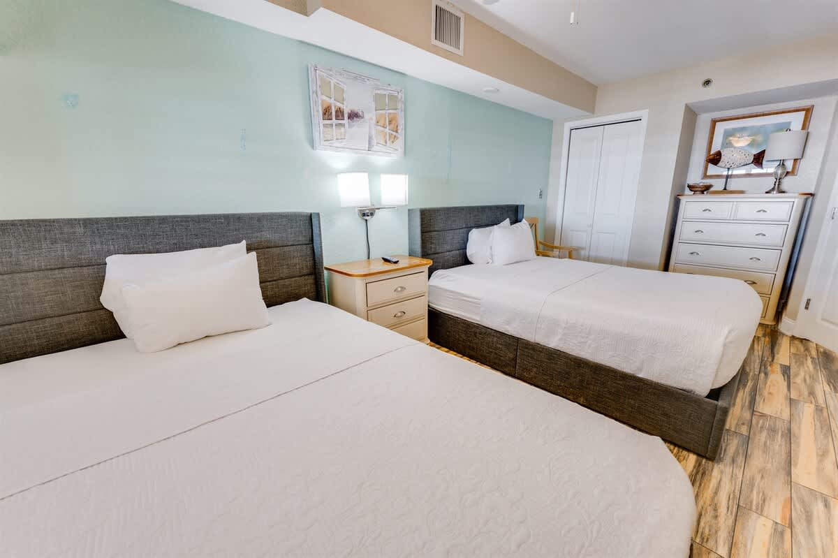 The condo includes one bedroom with two queen beds, along with a sofa bed in the living area. Room-darkening shades, extra pillows and blankets, and essentials help create a restful setting for evenings in.