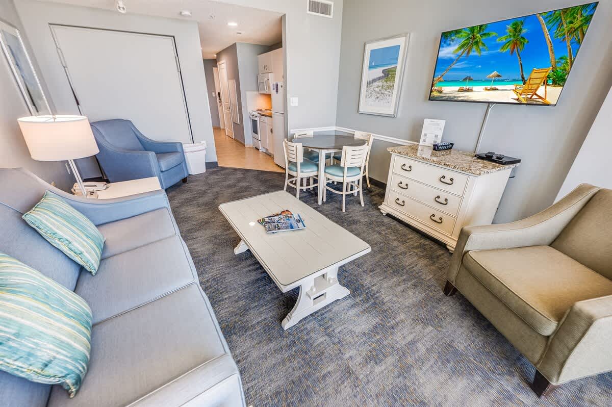 Located on the 16th floor, this entire condo offers a comfortable layout designed for relaxed coastal living. Large windows and a private balcony frame ocean and resort views, bringing the outdoors in while maintaining a sense of privacy. The living area invites you to settle in with the TV or simply enjoy the scenery, while the dining space provides an easy spot to share meals or linger over coffee.