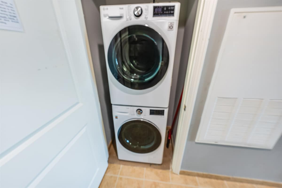 The bathroom includes a bathtub and shower, along with bathroom essentials. An in-unit washer and dryer add convenience, especially for longer stays or beach days.