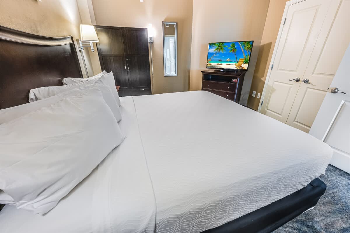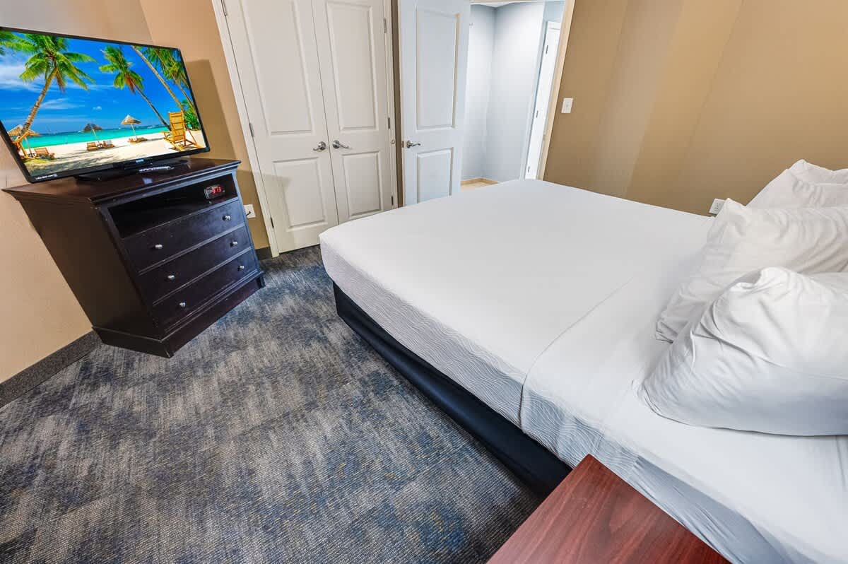 The condo sleeps up to four guests. The bedroom features a king bed, and an additional Murphy bed provides flexible sleeping space for couples or small families. Bed linens are provided to keep your stay simple and comfortable.